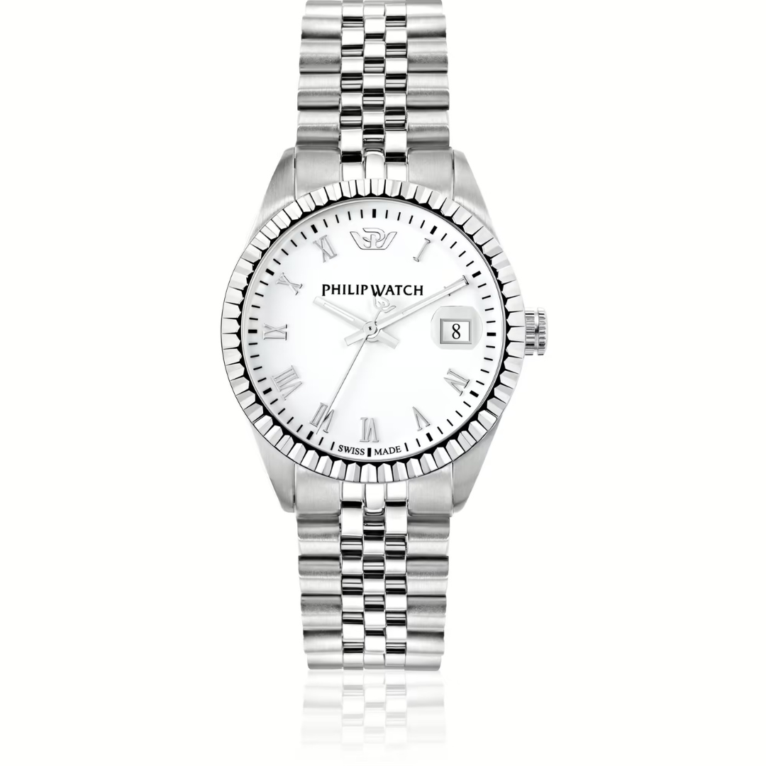 The Philip Watch unisex time-only watch from the Caribe collection, code R8253597515, is made entirely of steel and stands out for its sophisticated design and casual style. It's a timeless accessory, a must-have for both men and women, and transcends current trends. The round 35mm case and strap are made entirely of stainless steel, making them both durable and rustproof. The white dial features elegant Roman numeral hour markers. Equipped with a quartz movement, a screw-down caseback and crown, and a deployant clasp, this Philip Watch unisex time-only watch from the Caribe collection is water resistant to 10 ATM, making it comfortable to wear in any circumstance without fear of damage. Our store offers you the opportunity to purchase the Philip Watch Caribe R8253597515 unisex time-only watch online at an exclusive price. It comes complete with the original box and Philip Watch international warranty.