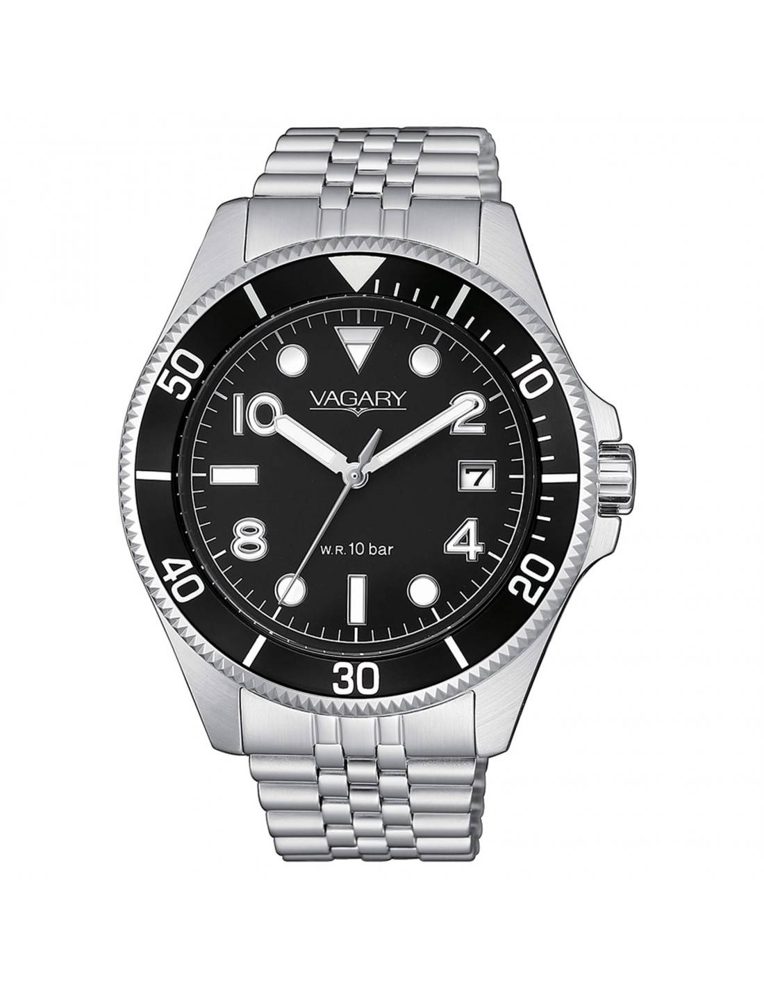 Vagary Aqua39 watch, reference VD5-015-51. Quartz movement, time and date only. 41mm steel case. Mineral crystal. Black dial and black bezel, date display at 3 o'clock. Steel bracelet. Water resistance 10 ATM.