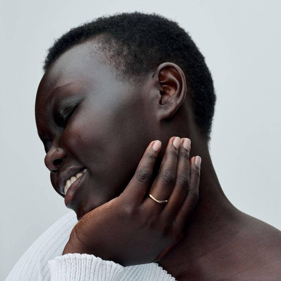 Opt for a minimalist design with the Sinuosa Line Ring. Crafted in 14k gold plating, this ring features a polished band with a sinuous line and varying thicknesses that create a wavy effect. The sinuous lines of this ring add a touch of modernity to your jewelry collection and make it perfect for pairing with different metal tones, stones, and colors, or with similar, simpler pieces for an elegant look.