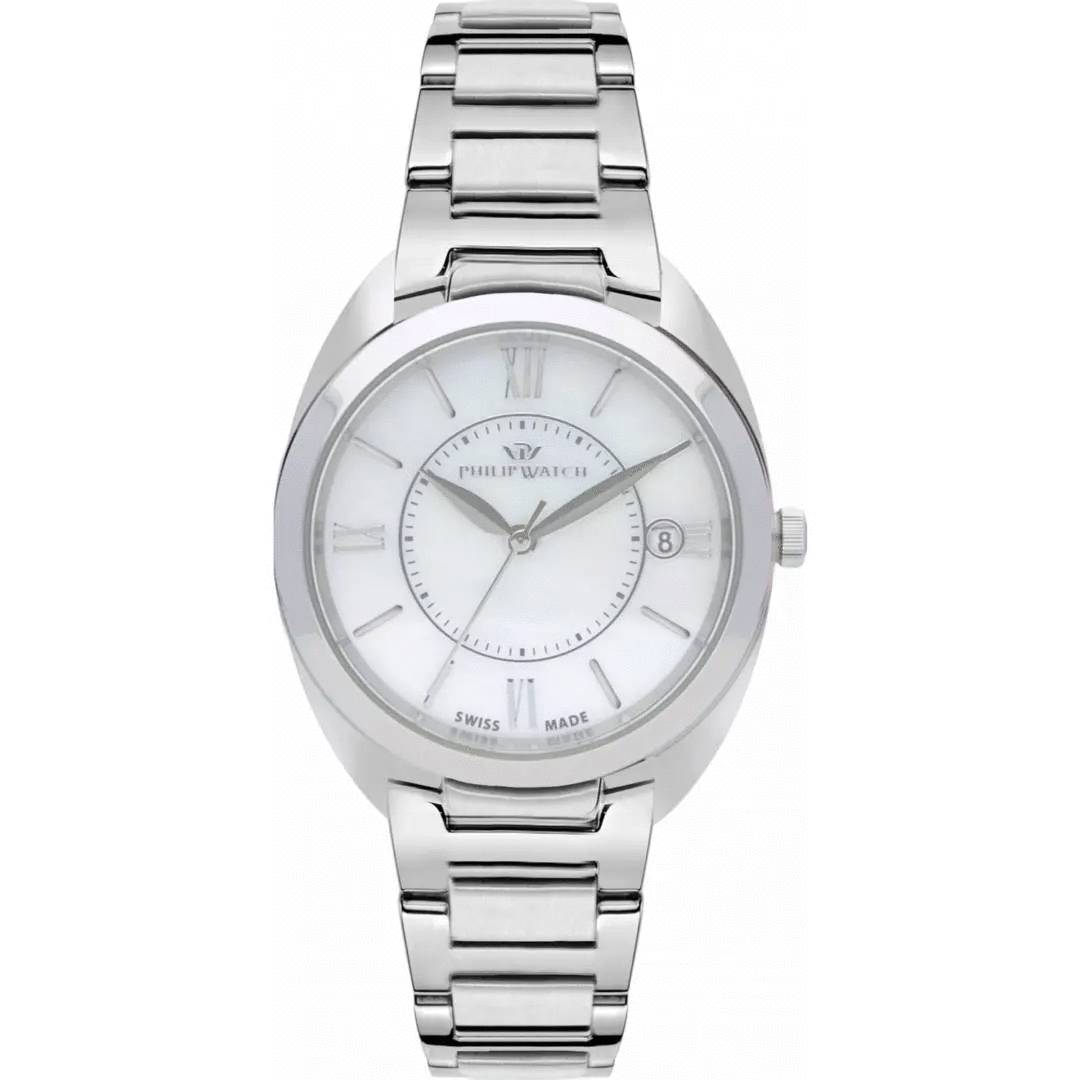 Philip Watch women's watch from the Lady collection, 32 mm polished steel case, screw-down case back, sapphire crystal, silver steel strap, deployment buckle closure, water resistant: 5 atm, official 2-year warranty and original Philip Watch packaging.
