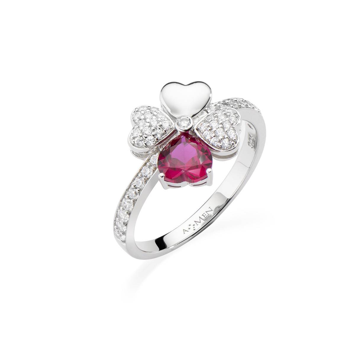 Anillo ajustable de plata 925 con trébol de cuatro hojas, cada pétalo tiene forma de corazón.