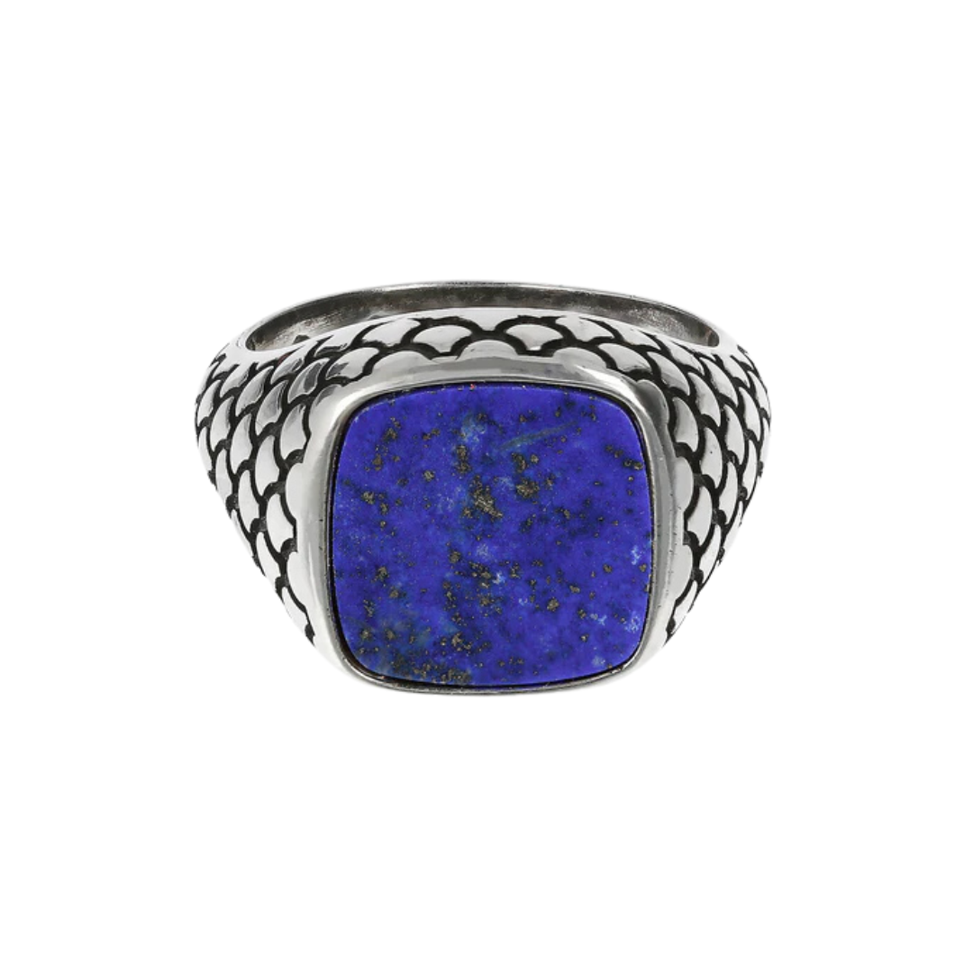Anillo de sello para hombre Albert M. realizado en plata 925 con textura de sirena y piedra natural de lapislázuli en forma cuadrada (12x12).