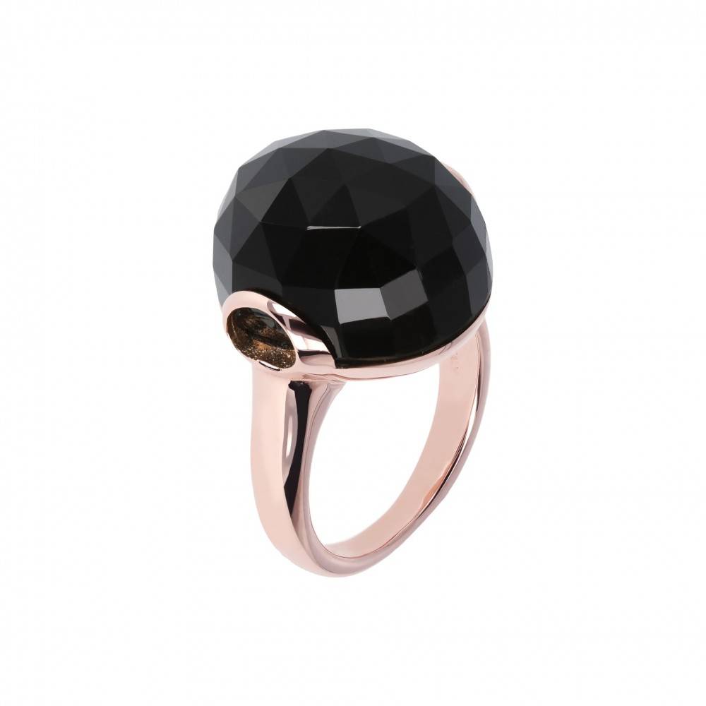 Anillo de oro rosa con una piedra redonda de ónix negro. Esta joya Golden Rose, bañada en oro rosa de 18 quilates, está disponible en varios colores contrastantes: ¡elige tu favorito! Combínala con el collar y los pendientes de araña a juego o con otras creaciones de la colección Felicia.