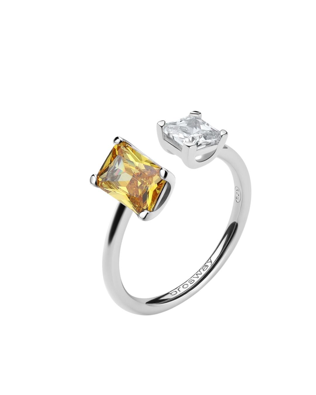 Anello in argento rodiato 925‰ con square cubic zirconia chiaro e baguette cubic zirconia colore golden yellow.