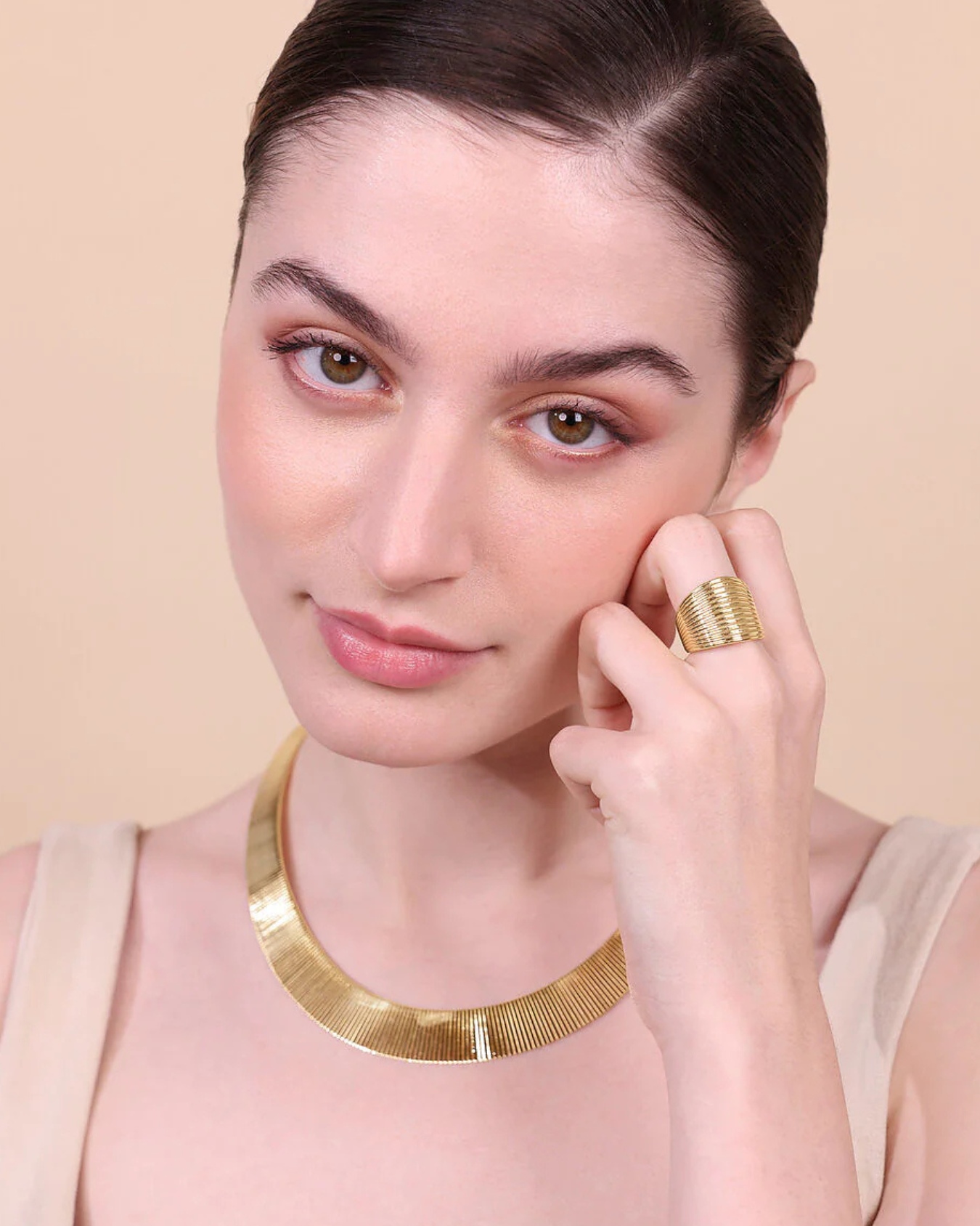 Anillo de banda realizado en aleación dorada, bañado en oro amarillo de 18kt, con diseño degradado y superficie estriada.