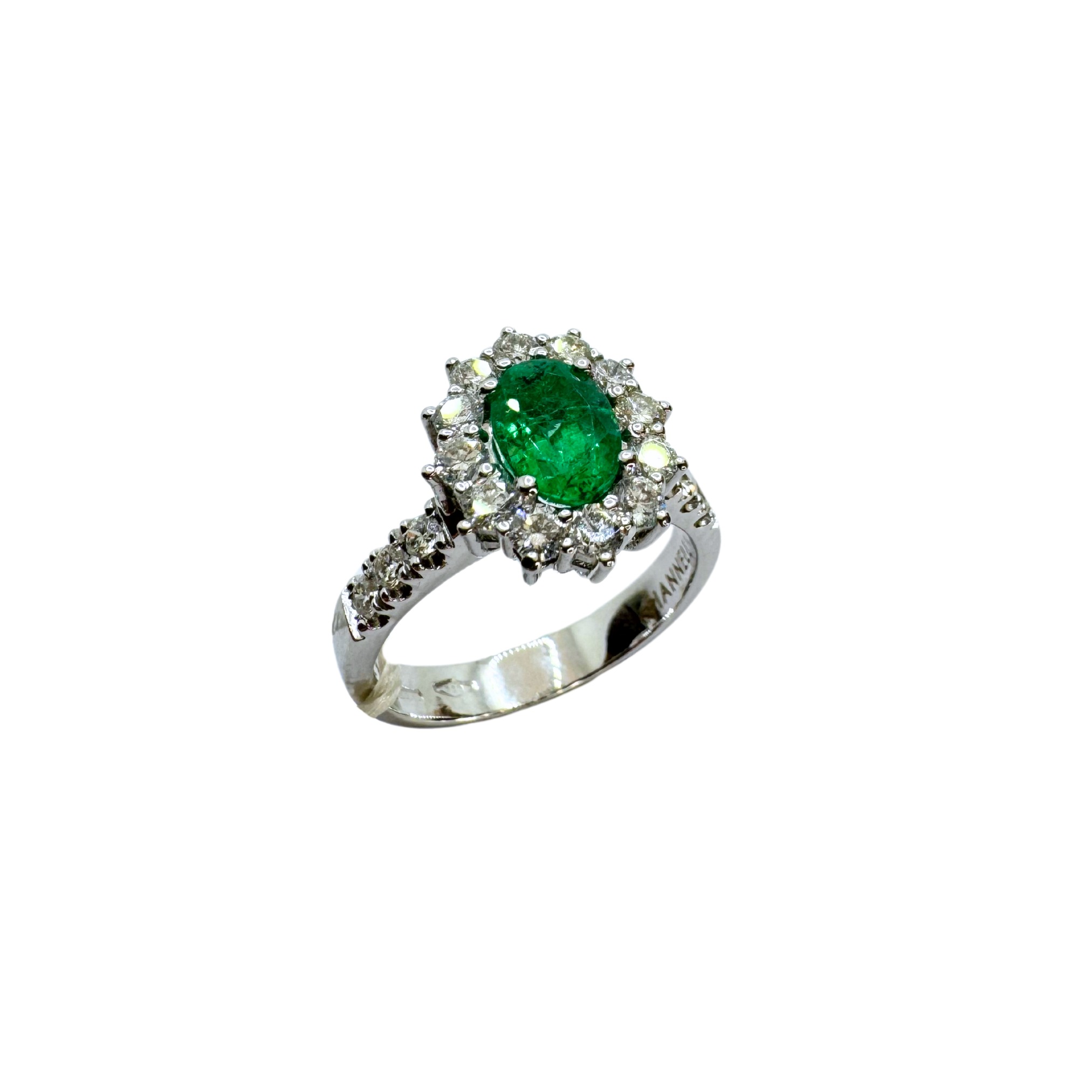 Anillo de oro blanco con esmeralda natural de talla ovalada y diamantes