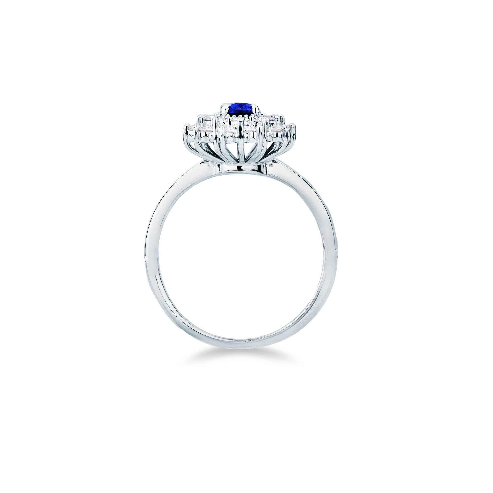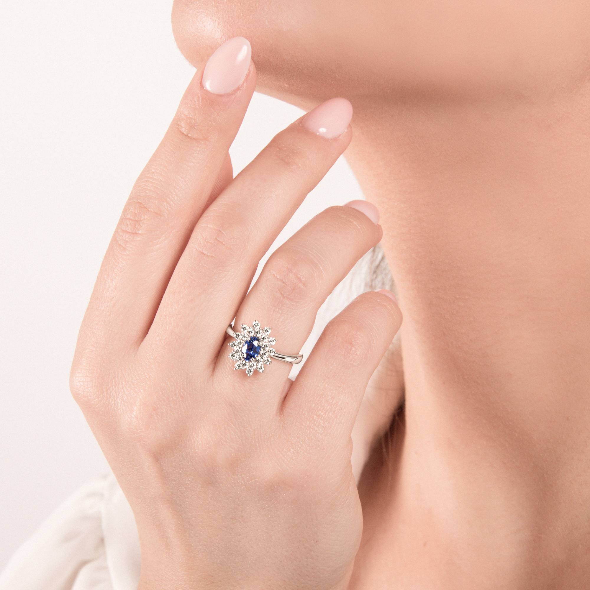 Espléndido anillo realizado en oro de 18 kt con un zafiro central de talla ovalada rodeado de una doble hilera de diamantes de extraordinario brillo.