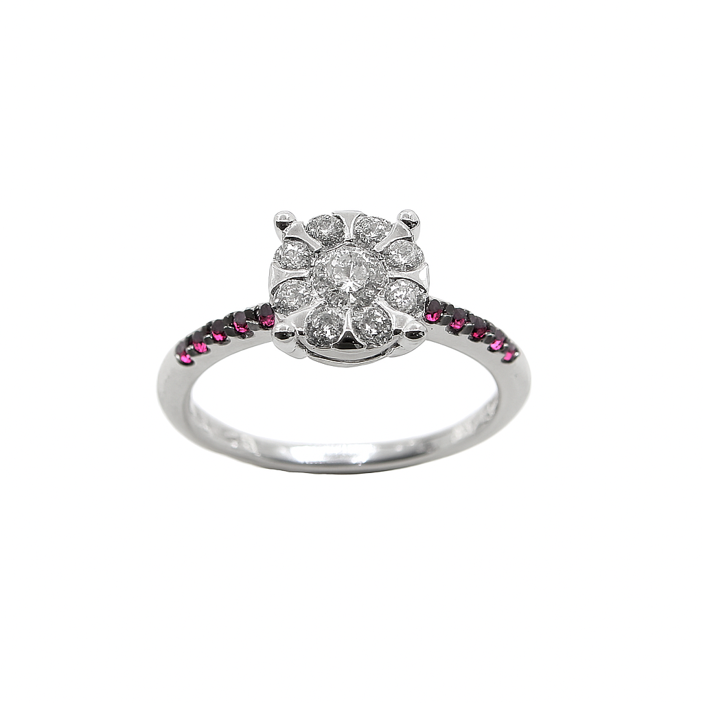 Anillo Mirco Visconti de oro blanco con centro de diamantes y rubíes en el cuerpo