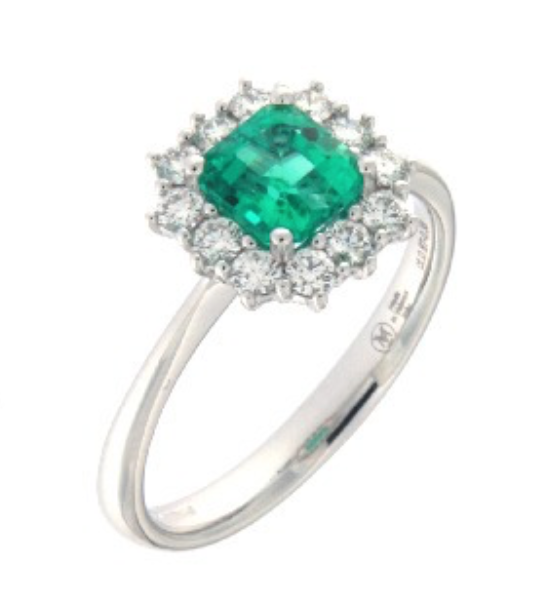 Un refinado anillo elaborado en oro blanco de 18 kt con una esmeralda colombiana natural de talla octagonal rodeada de diamantes blancos de talla brillante. Los recuerdos suelen ser en blanco y negro, pero las emociones que evocan siempre son coloridas. Son emociones eternas que se nutren día tras día. Pasión, el deseo de crear, la ambición de destacar, de dejar una huella preciosa de la propia muerte. Este es el alma de la joyería Mirco Visconti. Un regalo espléndido para una ocasión especial: un aniversario, una promesa de amor eterno o simplemente un cumpleaños inolvidable.