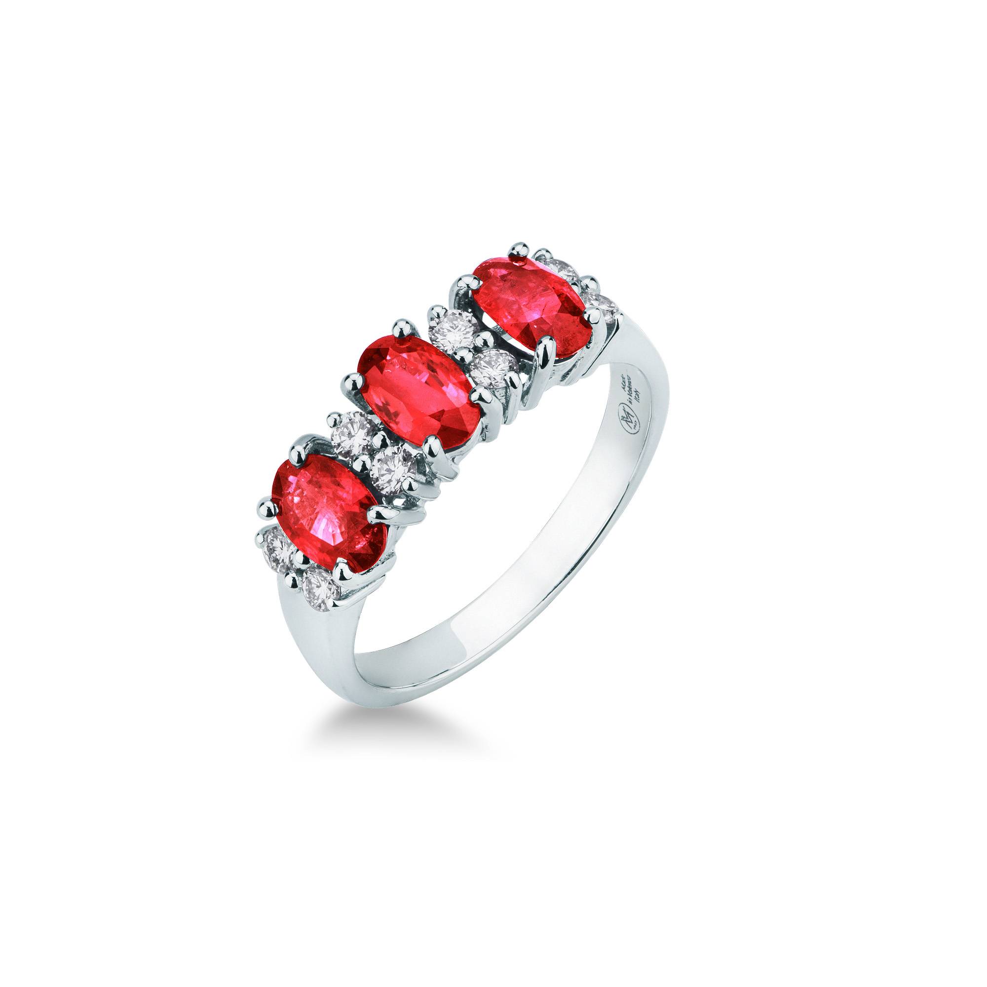 Un anillo trilogía se compone de tres piedras preciosas, y posee un fuerte significado simbólico ligado al ámbito sentimental: el amor por la pareja se expresa en el pasado, presente y futuro a través de un regalo decididamente elegante. El significado intrínseco de la trilogía se complementa con los valores del rubí rojo: amor y pasión, fuerza vital y fuego interior. Este elegante anillo está elaborado en oro blanco de 18 kt y luce tres rubíes birmanos naturales de talla ovalada.
