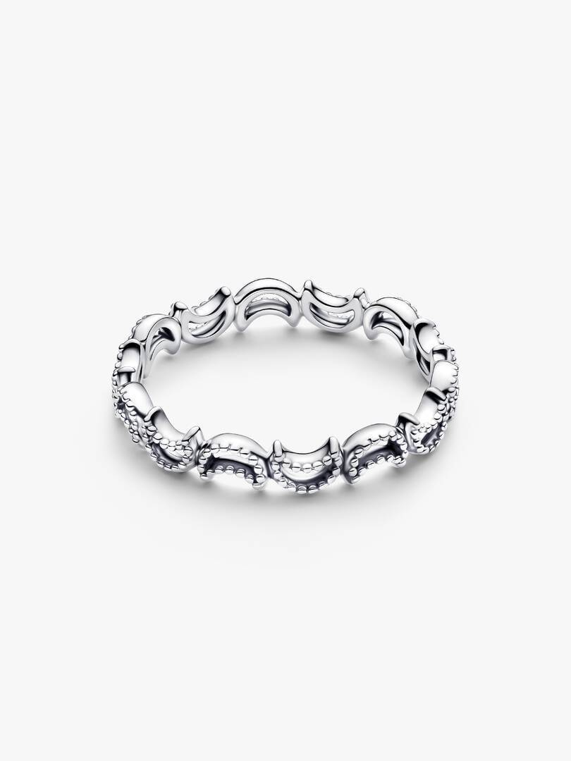 Descubre la magia del cielo nocturno. El anillo Crescent Moon de plata de ley 925 presenta una hilera de lunas conectadas con esferas, símbolo de unidad cósmica.