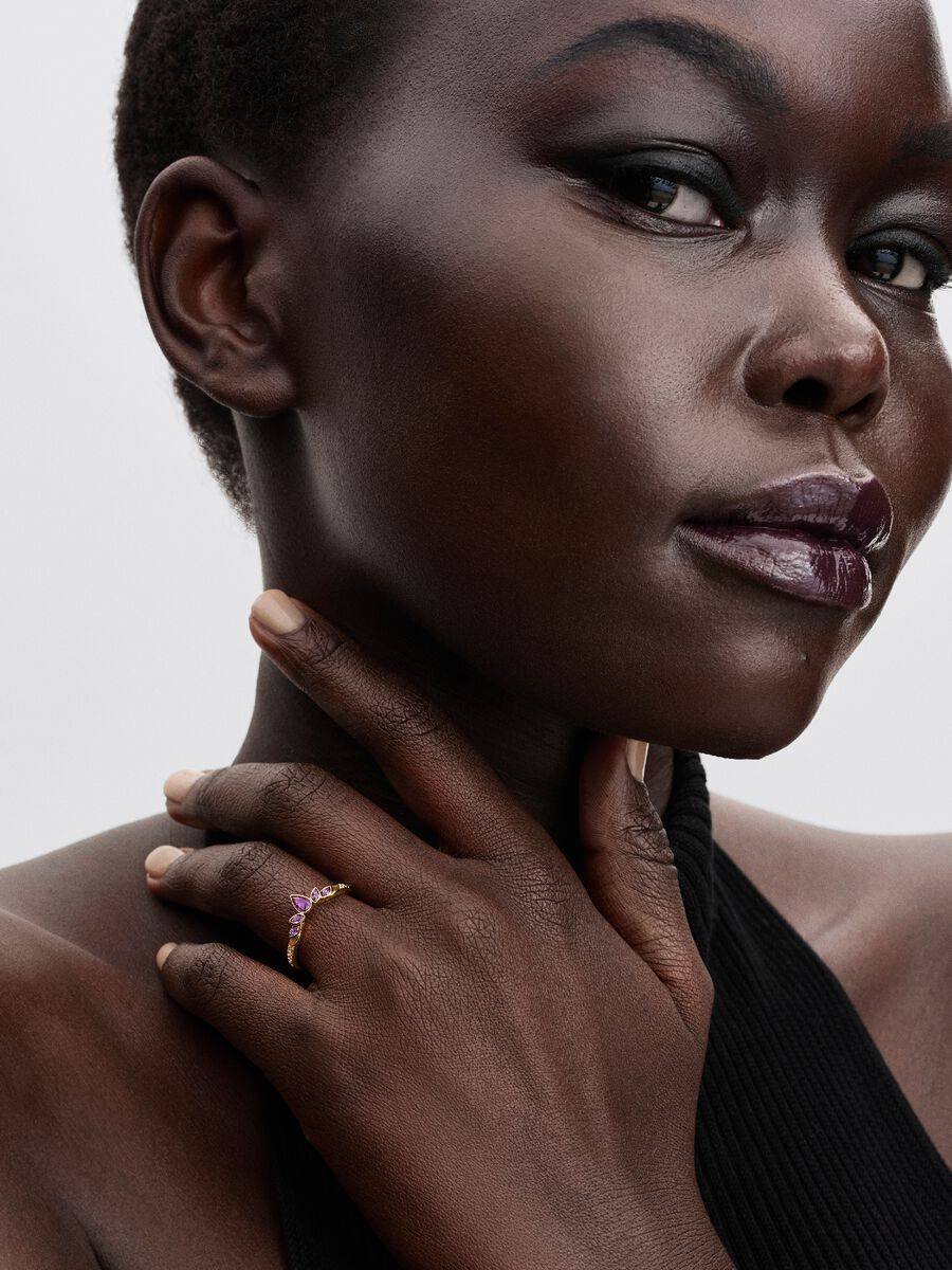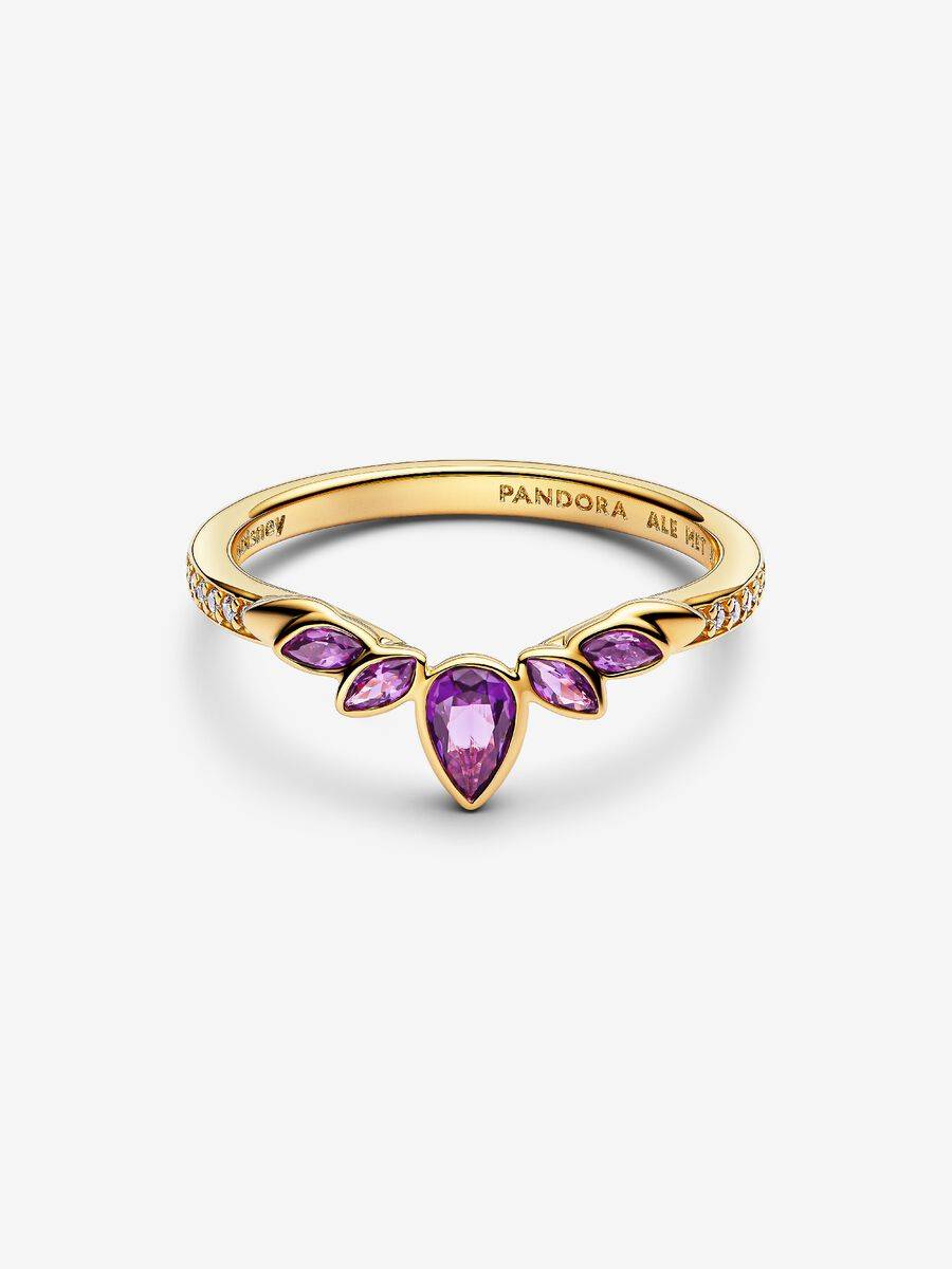 Demuestra tu pasión por Frozen de Disney con nuestro anillo Tiara bañado en oro de 14k. Inspirado en la calidez y alegría de la reina Ana, el anillo luce una constelación de piedras moradas que reflejan la luz.