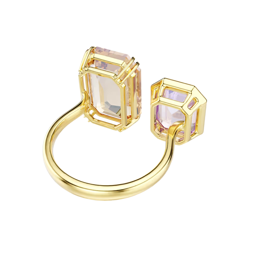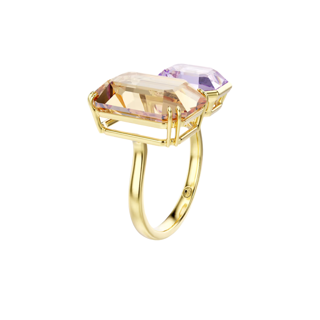 Este anillo de cóctel asimétrico se convertirá en una de tus piezas favoritas. Su banda abierta bañada en oro luce un cristal morado engastado en bisel en un lado y un cristal color caramelo engastado en dos garras en el otro. Llévalo solo o combínalo con otros anillos de la familia Millenia para una interpretación impecable de la elegancia moderna.
