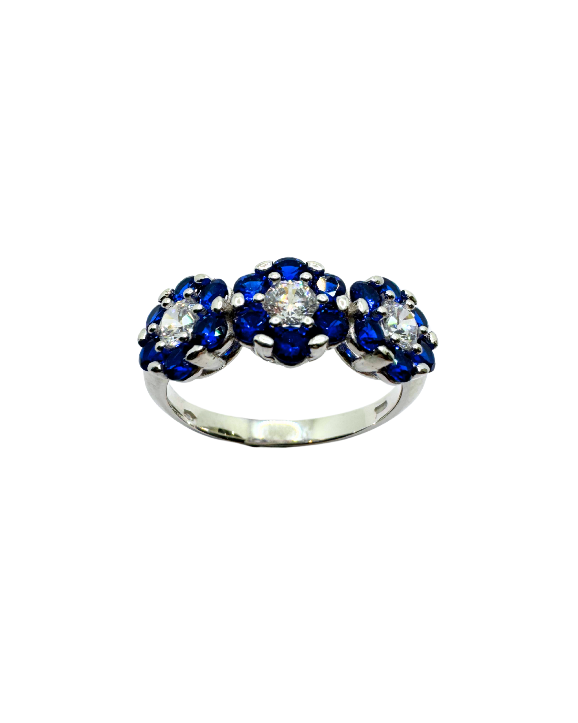 Anillo Trilogía de Oro Blanco de 18 KT con Flores Mágicas y Circonitas Blancas y Azules
