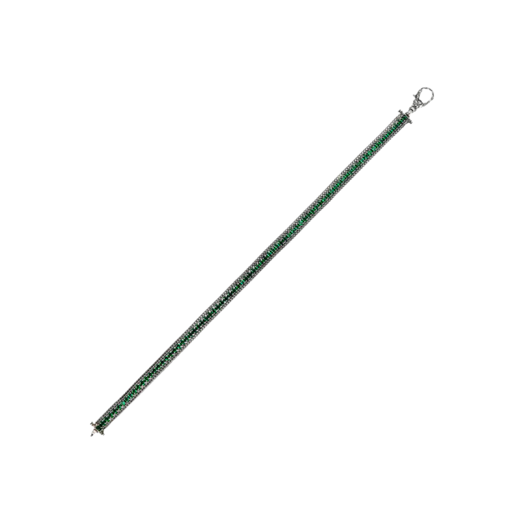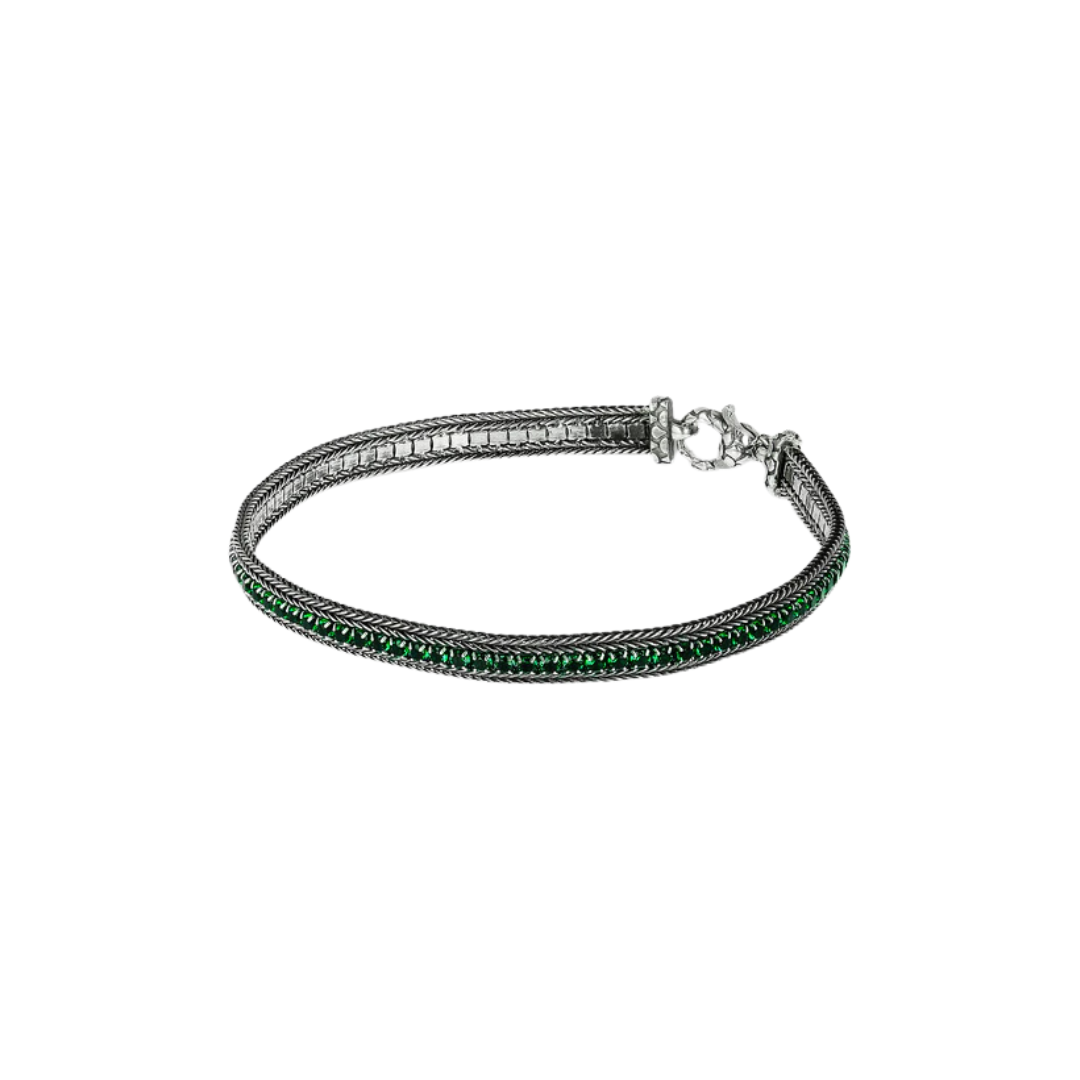 Pulsera para hombre Albert M. elaborada en plata 925 y adornada con una doble cadena de espigas con una riviera central de piedras naturales o circonitas. Su cierre de mosquetón con textura de sirena la hace ideal para combinar con cualquier look.