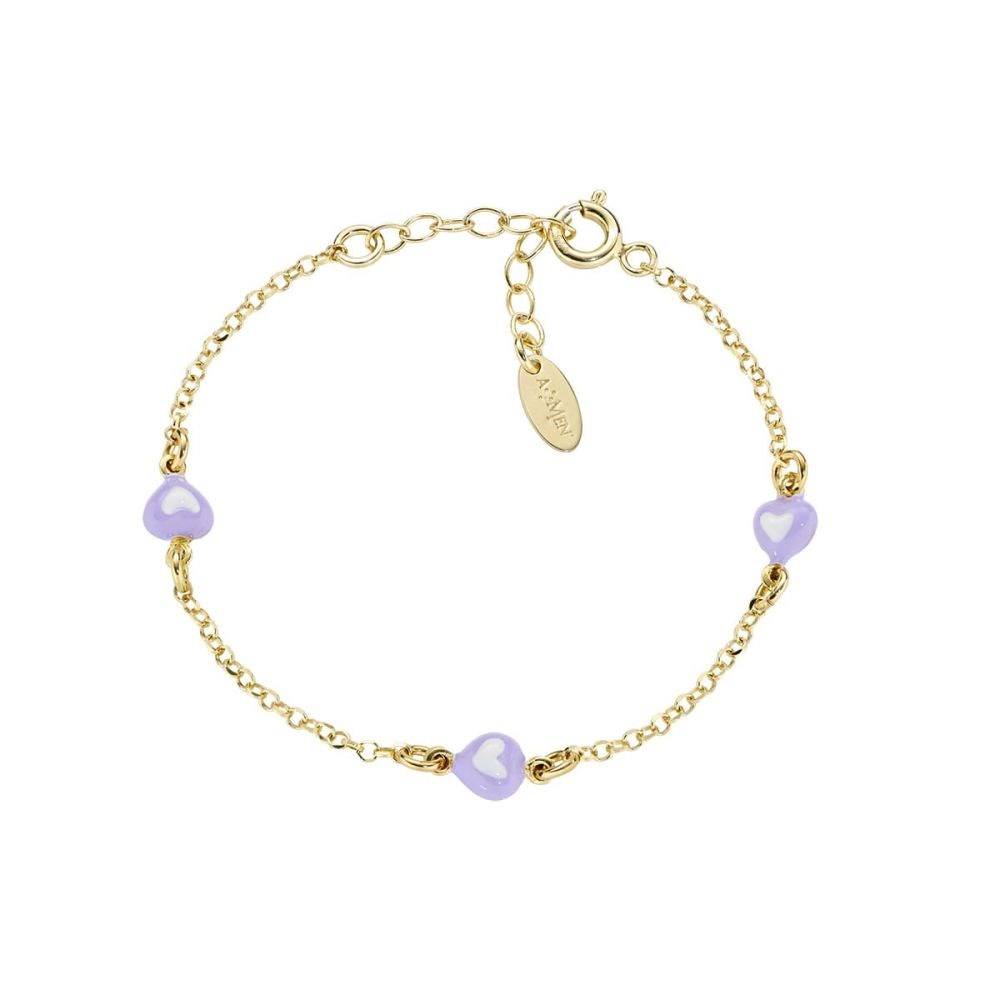 Pulsera para niña Amen, colección infantil, en plata 925 bañada en oro con tres corazones esmaltados con glicina. Tamaño 14+3 cm.