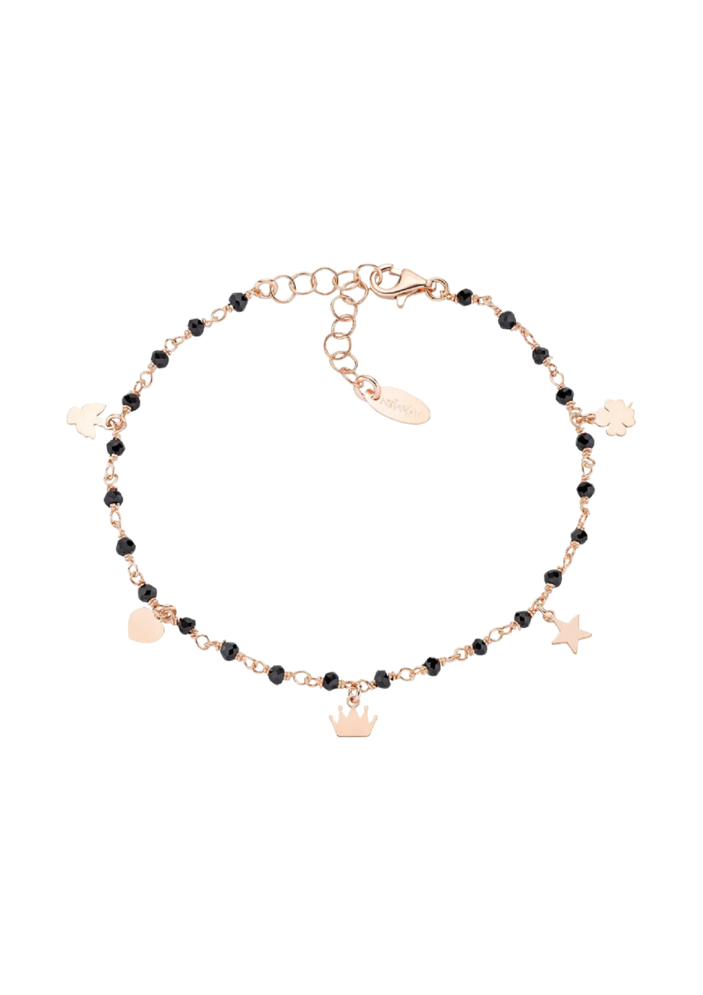Pulsera de cadena de la colección Amen Elegance para mujer. Color: oro rosa y negro. La pieza está hecha de plata 925 con baño de oro rosa, adornada con cristales negros y charms en forma de corazón, estrella, paloma, corona y trébol de cuatro hojas. Cierre de mosquetón.
