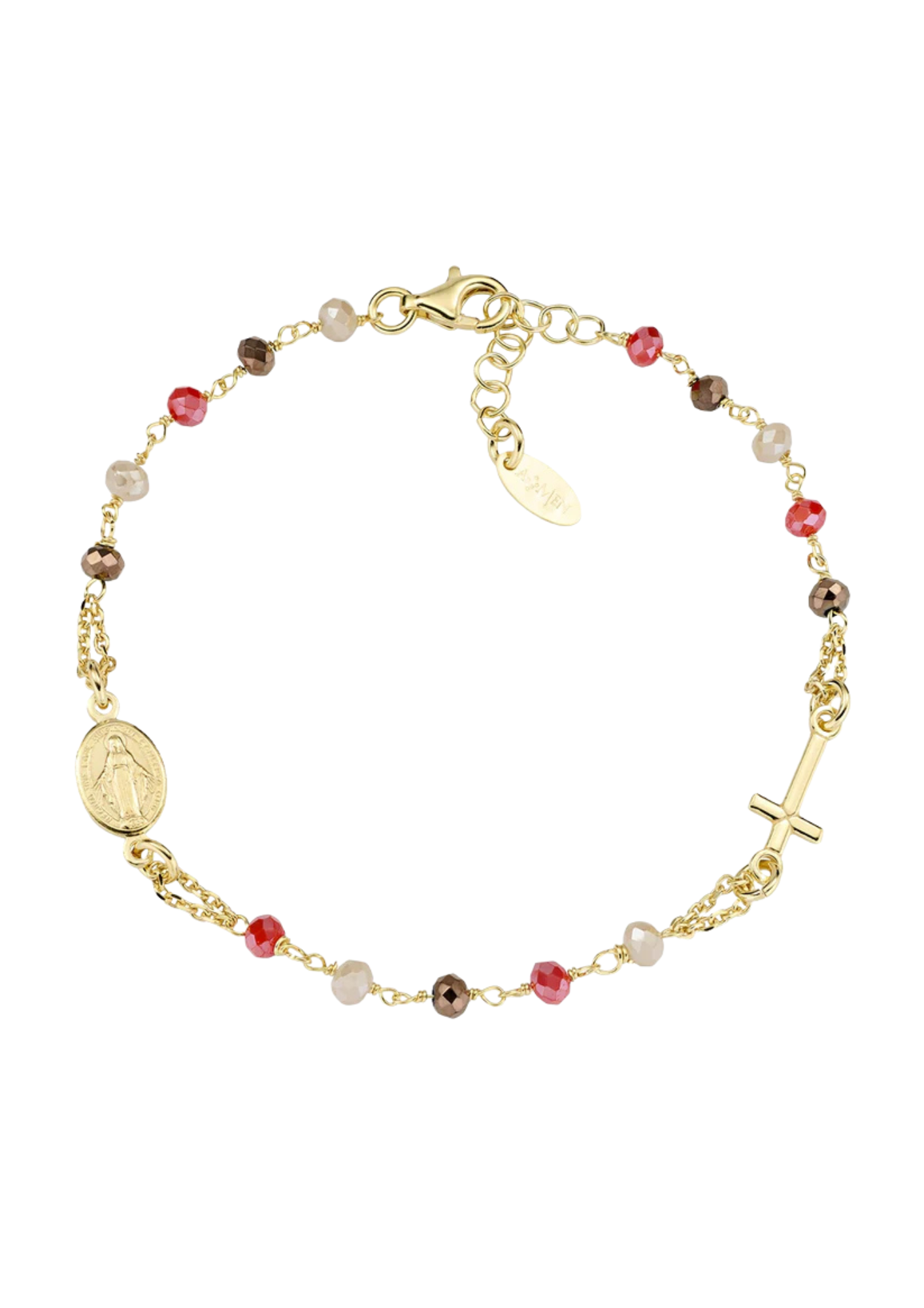 Pulsera rosario de plata 925 con acabado chapado en oro, con cuentas de cristal facetado de 3 mm en tonos marrón, gris y rojo coral, una cruz y una medalla de la Virgen Milagrosa. La pulsera se puede ajustar de 18 a 20 cm de largo mediante cierre de mosquetón y cadena extensible.