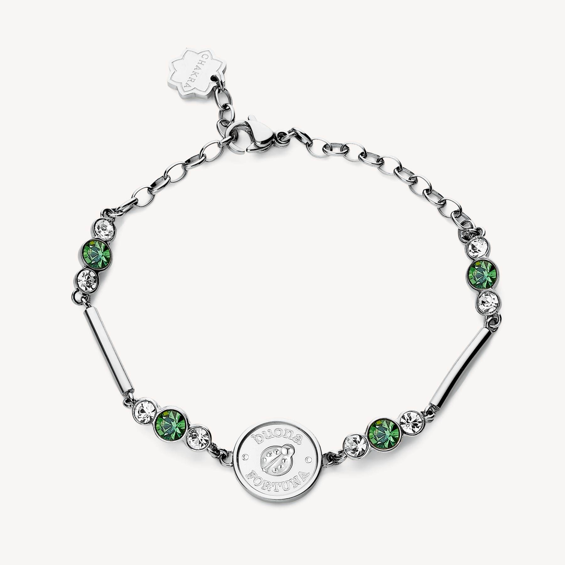 Esta pulsera de acero inoxidable forma parte de la colección Chakra y luce cristales verdes. Regalar una joya Brosway con el símbolo de la mariquita, que evoca la búsqueda de la felicidad y la buena fortuna, significa recordarles a nuestros seres queridos el cariño que sentimos por ellos. Un abrazo constante pero discreto, casi indisoluble.
