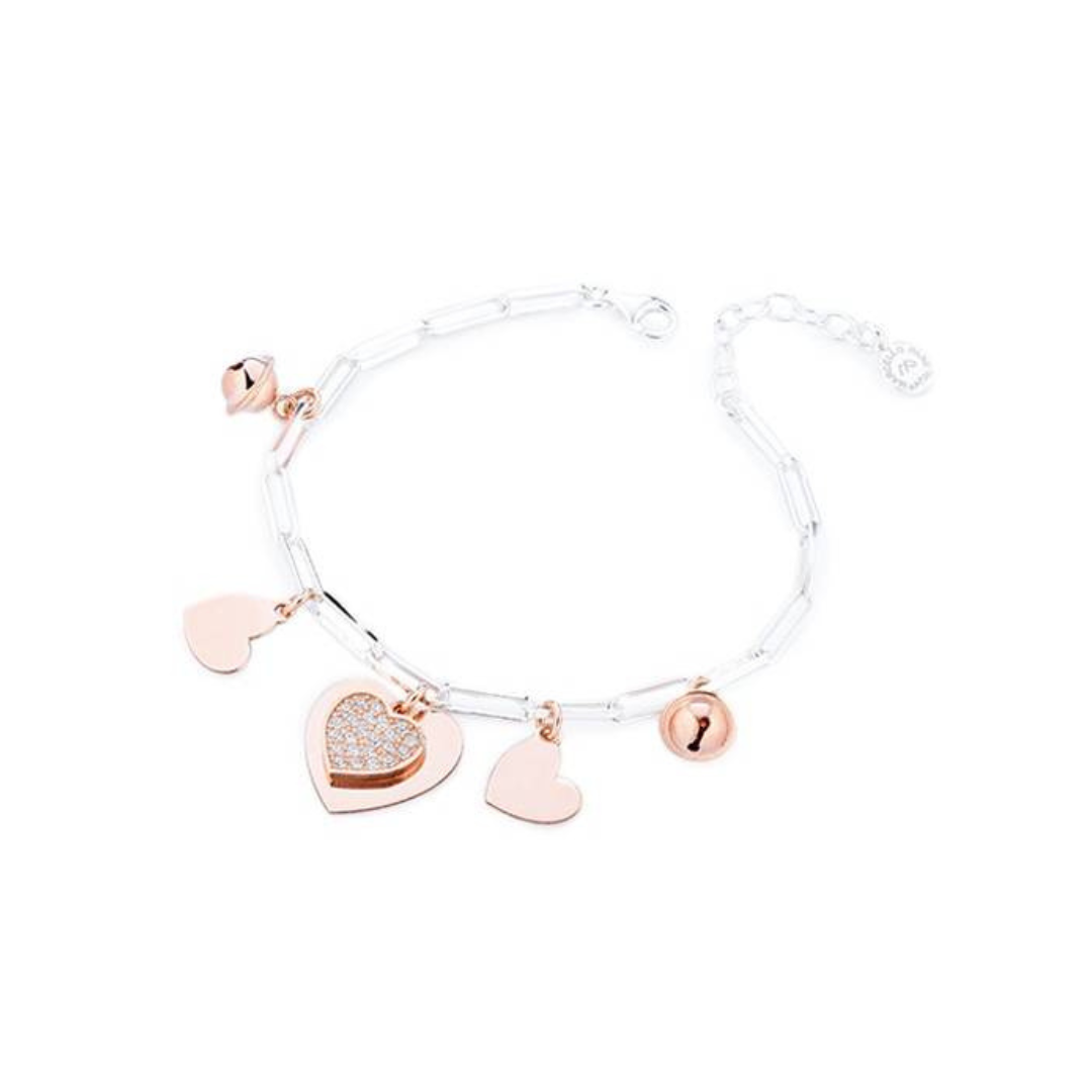 Pulsera de plata 925 con corazones con circonitas y colgantes de campanilla rosa de la colección Petite Boules.
