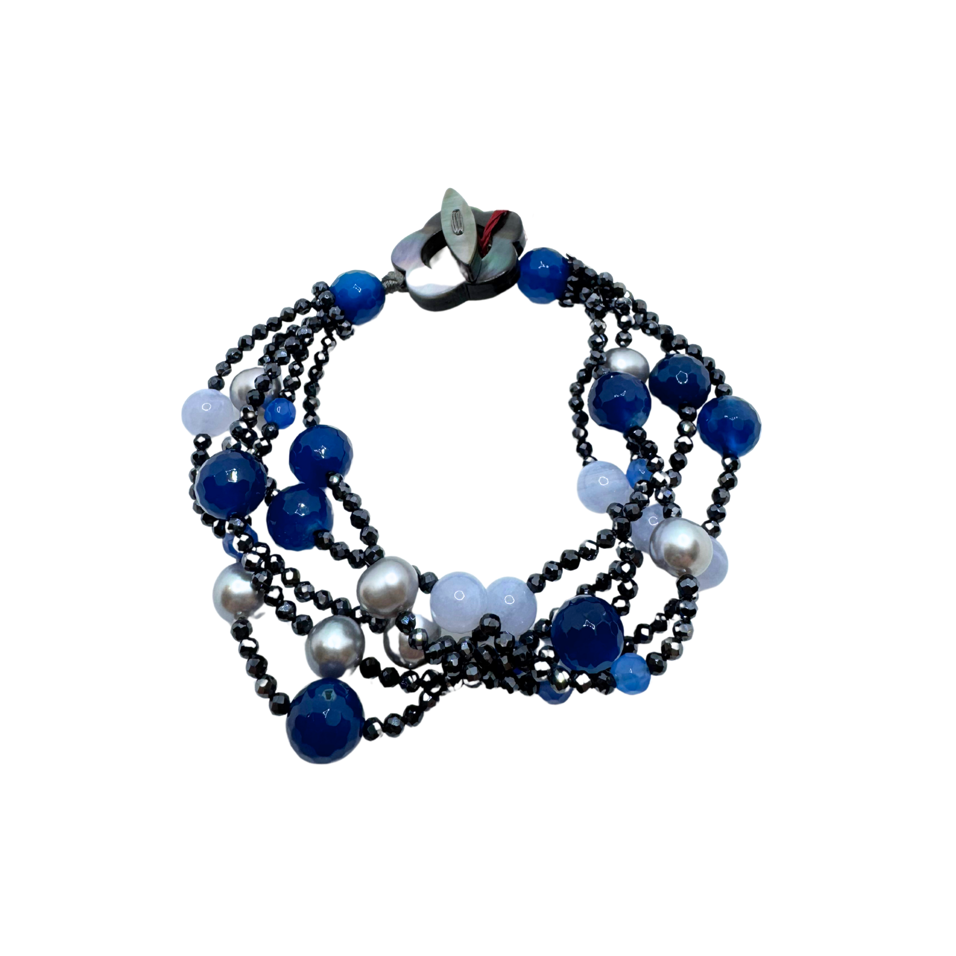 Pulsera de la colección Jazz de Rajola con espinela, ágata azul, calcedonia y perlas grises. Cierre de nácar con logotipo en oro blanco de 18 kt.