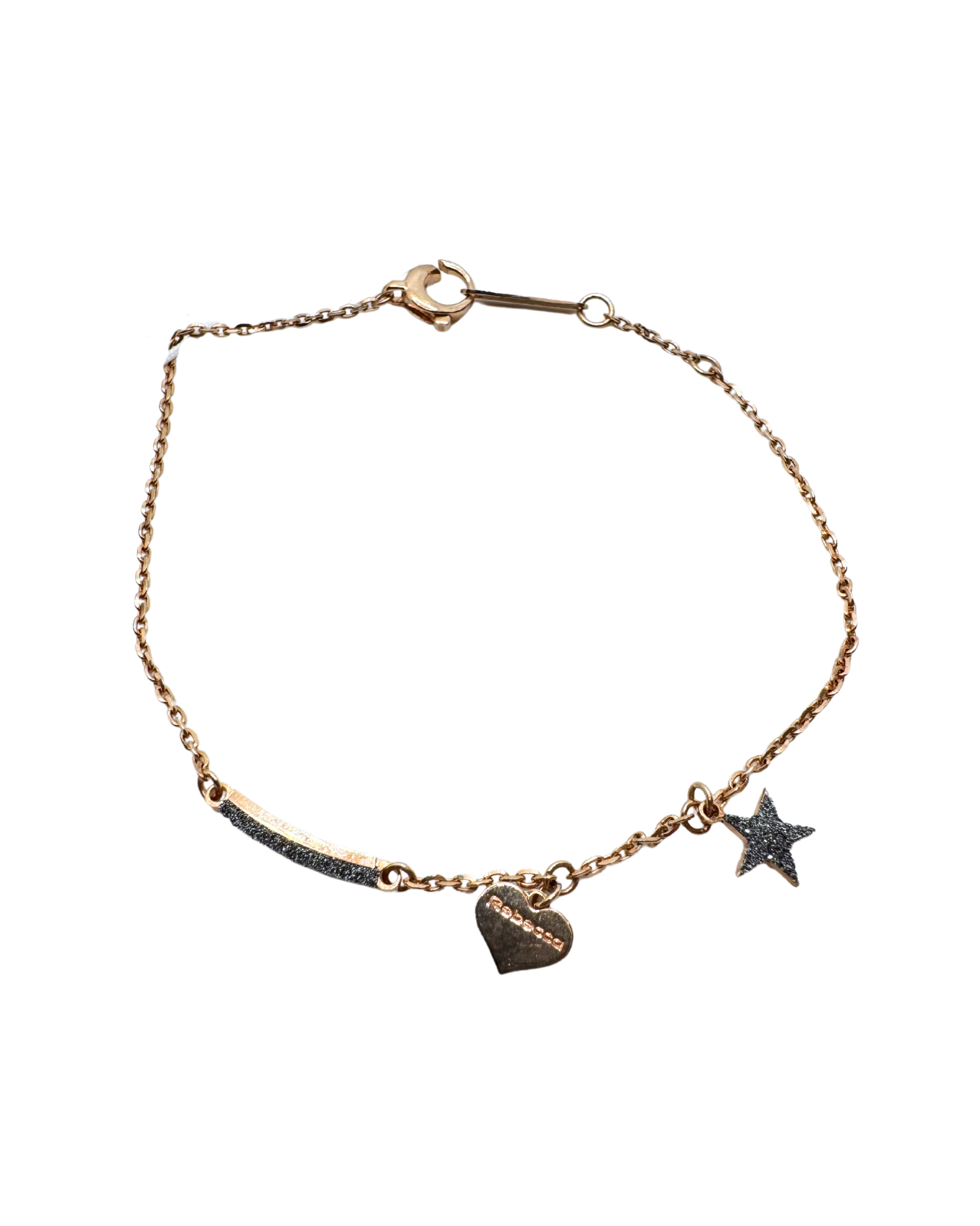 Pulsera para mujer de la colección Jolie de Rebecca en plata rosa 925 y polvo de diamante. La pulsera presenta una barra con un corazón y una estrella colgantes.