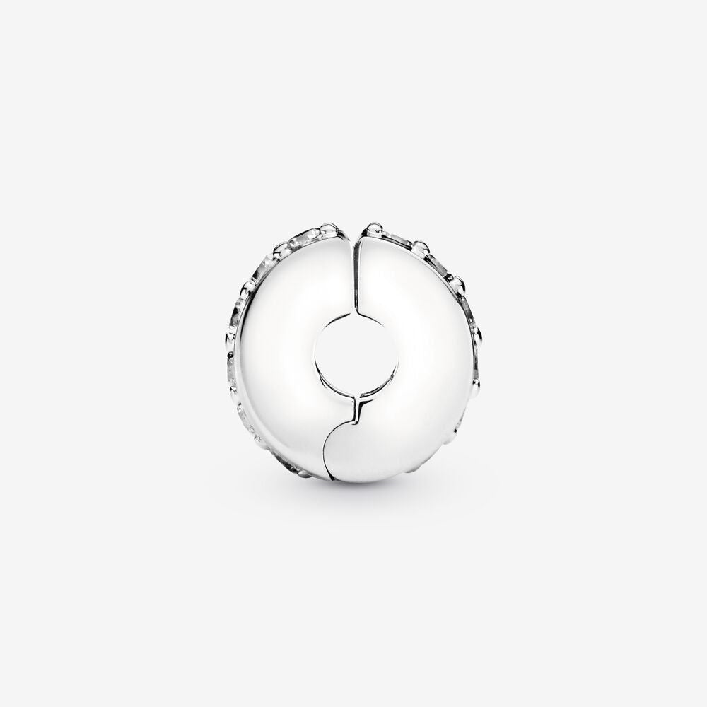 Los clips para charms Pandora Moments te ayudan a espaciar tus charms uniformemente, aportando equilibrio y belleza a tus pulseras. Elaborados en plata de ley, estos clips presentan una hilera de circonitas cúbicas en el centro. Añade una o dos piezas a cada extremo de la pulsera para añadir toques sutiles y brillantes. Nota: Este clip no tiene inserto de silicona y se deslizará por la pulsera si no se coloca en las roscas en relieve o entre dos separadores.