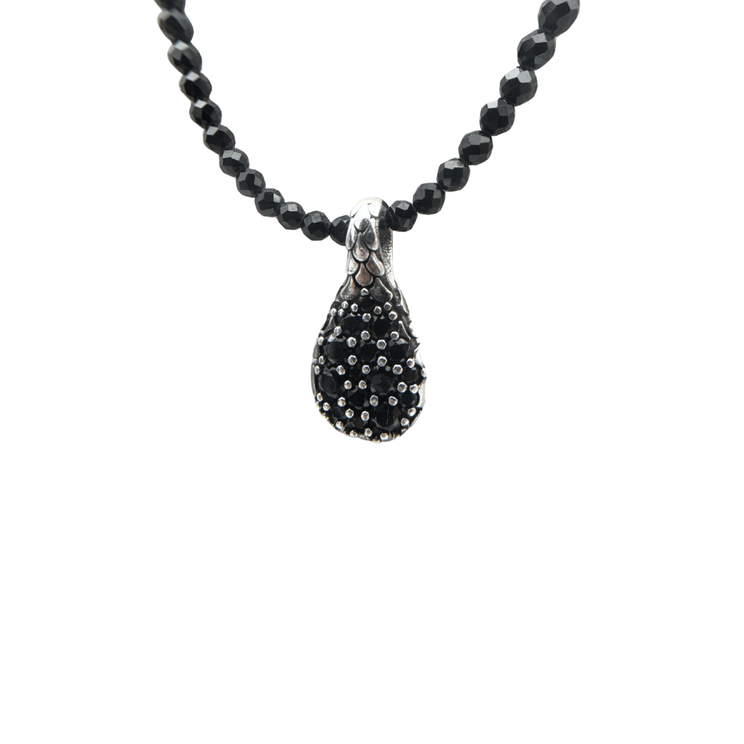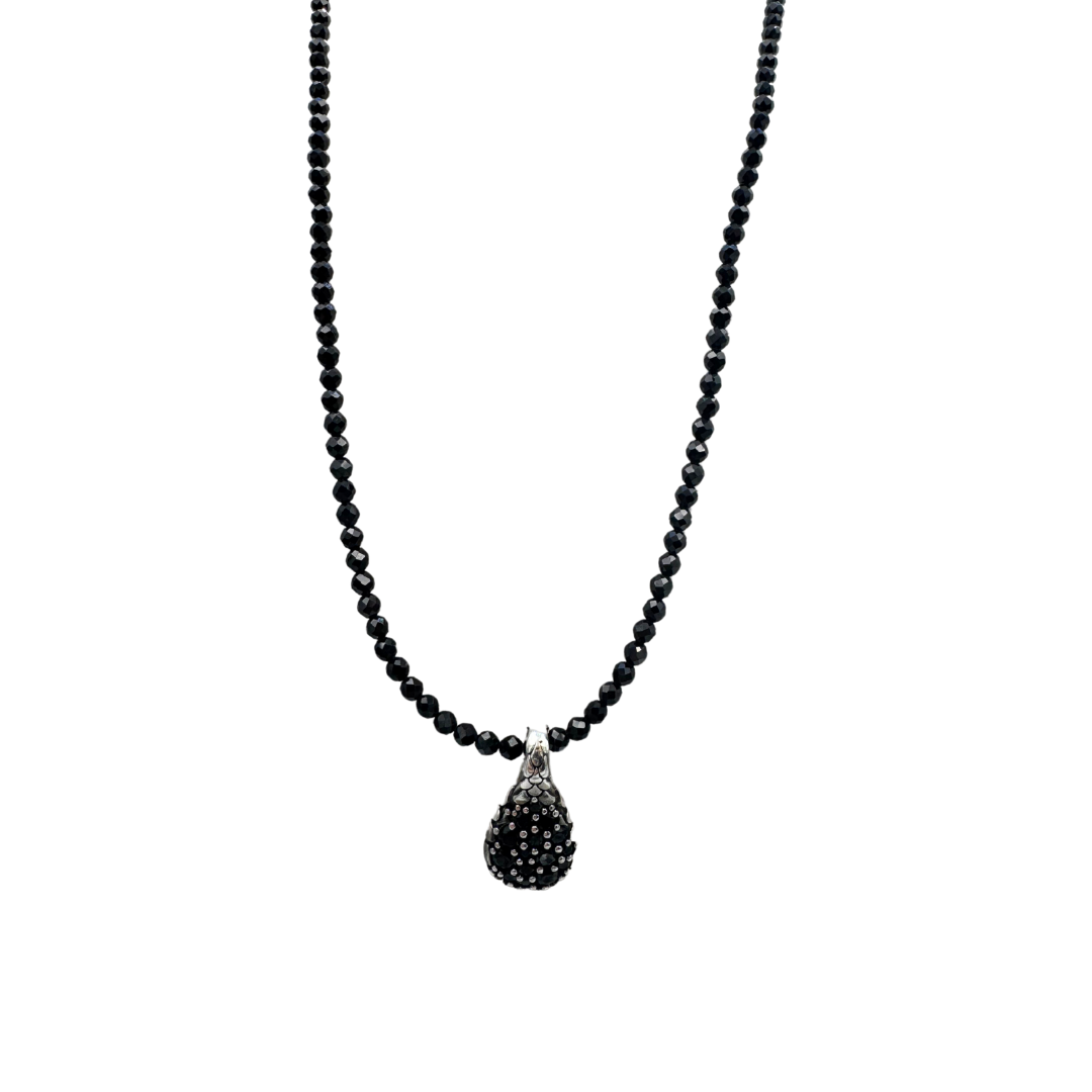 Collar Albert Mistero con cuentas de espinela negra y colgante de plata con textura de sirena y pavé de circonitas negras. Cierre de mosquetón. Largo: 45 cm.