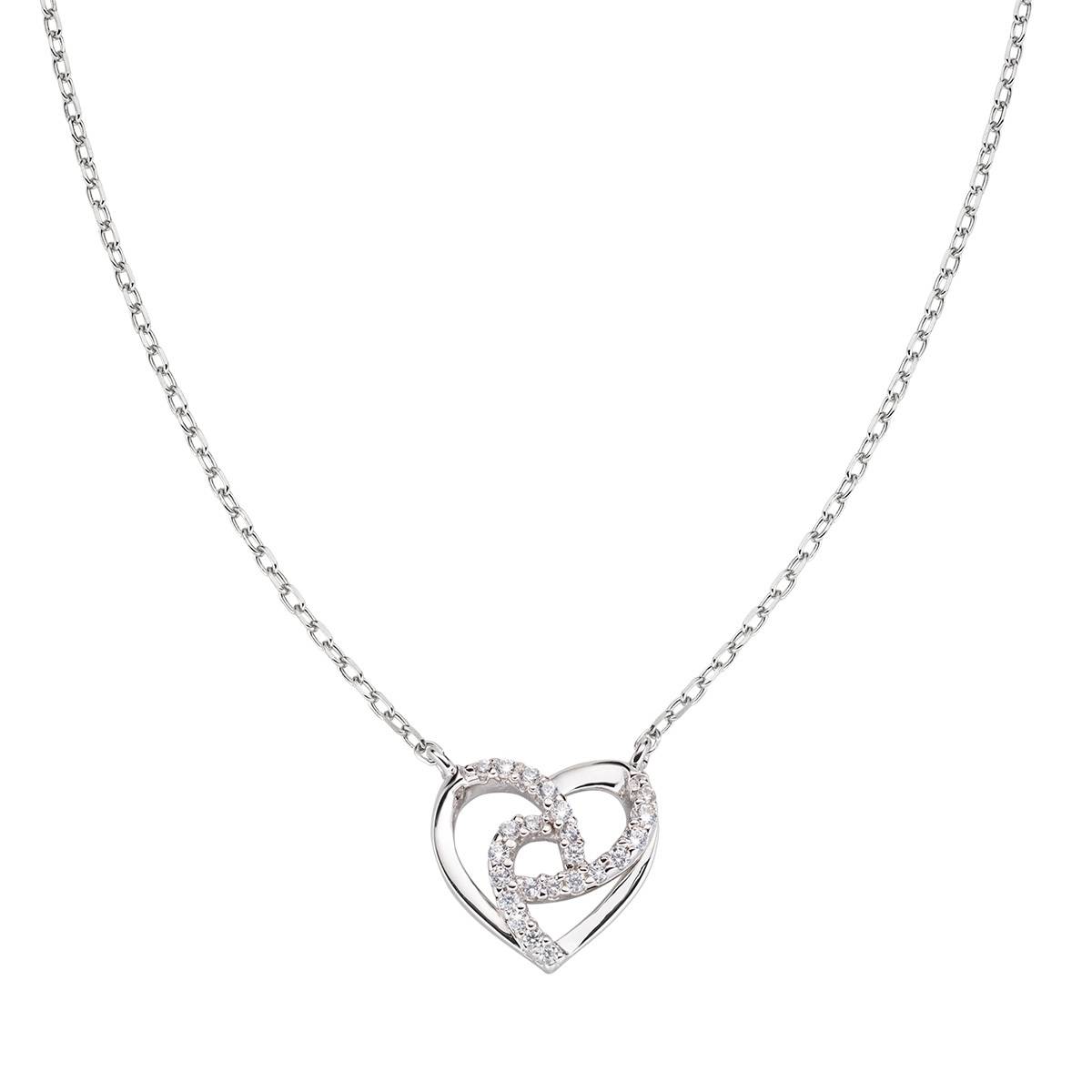 Collar de plata 925 con colgante en forma de corazón, elaborado con un juego de formas entrelazadas, resaltado por piedras de circonitas cúbicas.