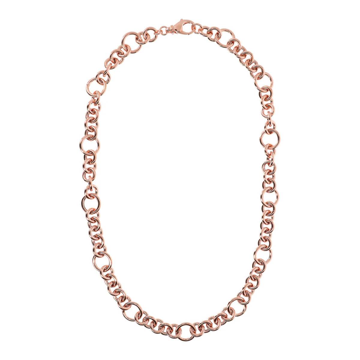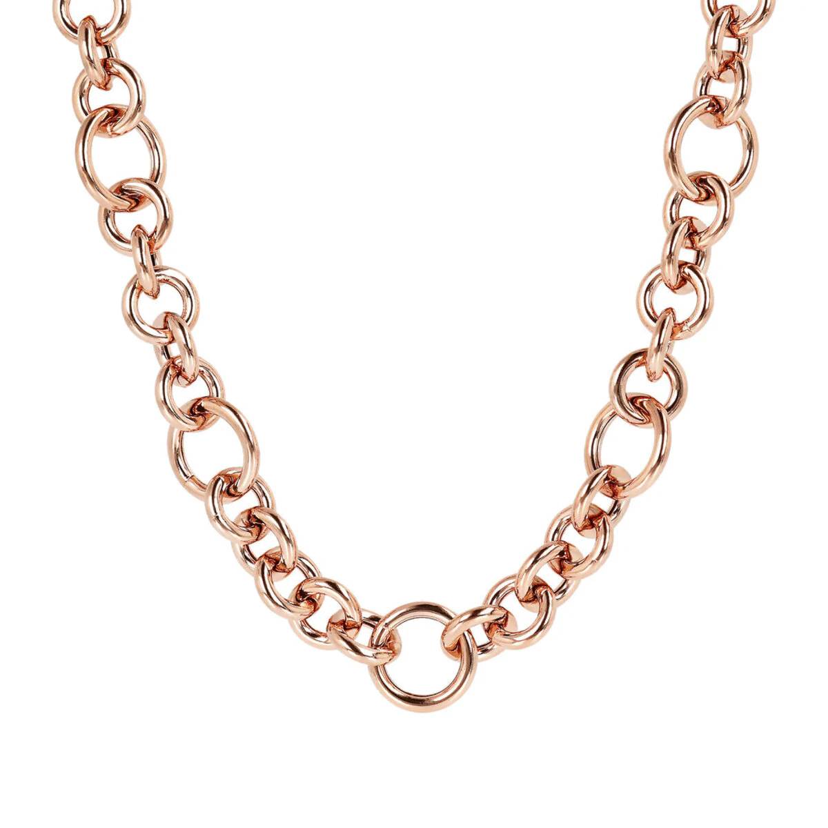 Un collar largo con un toque moderno: el clásico eslabón rolo se combina con maxi anillos en oro rosa de 18 quilates bañado en oro rosa. Una pieza original con un diseño 100 % italiano.