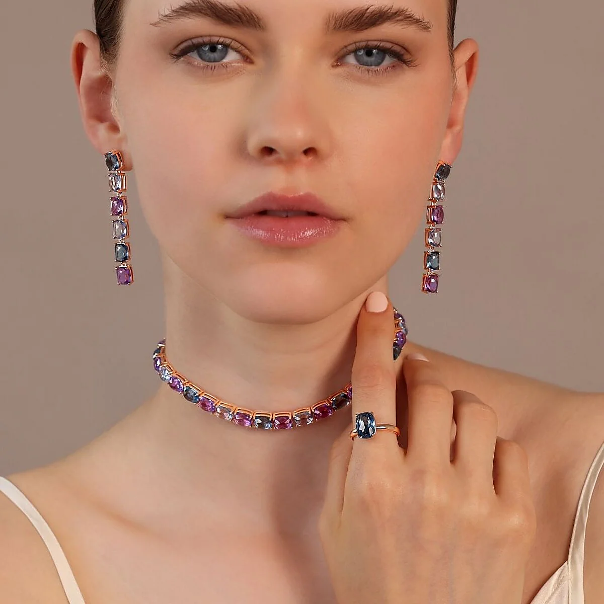 Gargantilla Bronzallure de aleación Golden Rosé, chapada en oro rosa de 18 kt, adornada íntegramente con piedras preciosas prismáticas rectangulares (8 x 11 mm) con corte mosaico. Cuenta con cierre de mosquetón y una longitud de 28,6 cm + 7,7 cm de extensión.