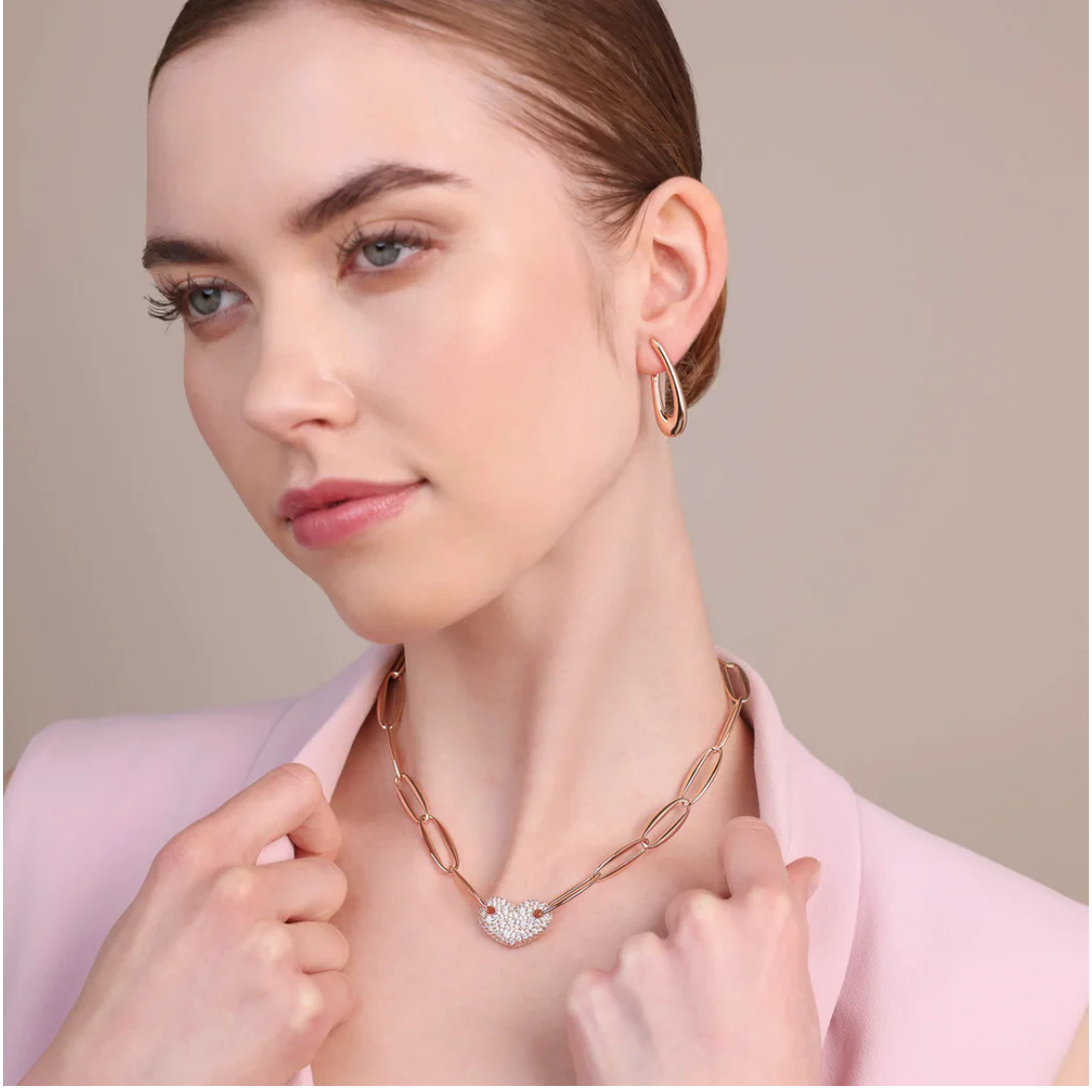 Gargantilla Bronzallure de aleación Golden Rosé, chapada en oro rosa de 18 kt, con eslabones marquesa pulidos (25 x 10 mm) y un colgante fijo en forma de corazón (23 x 13 mm) engastado con pavé de circonitas cúbicas luminosas. Largo: 42 cm + 4 cm de extensión. Cierre de mosquetón.