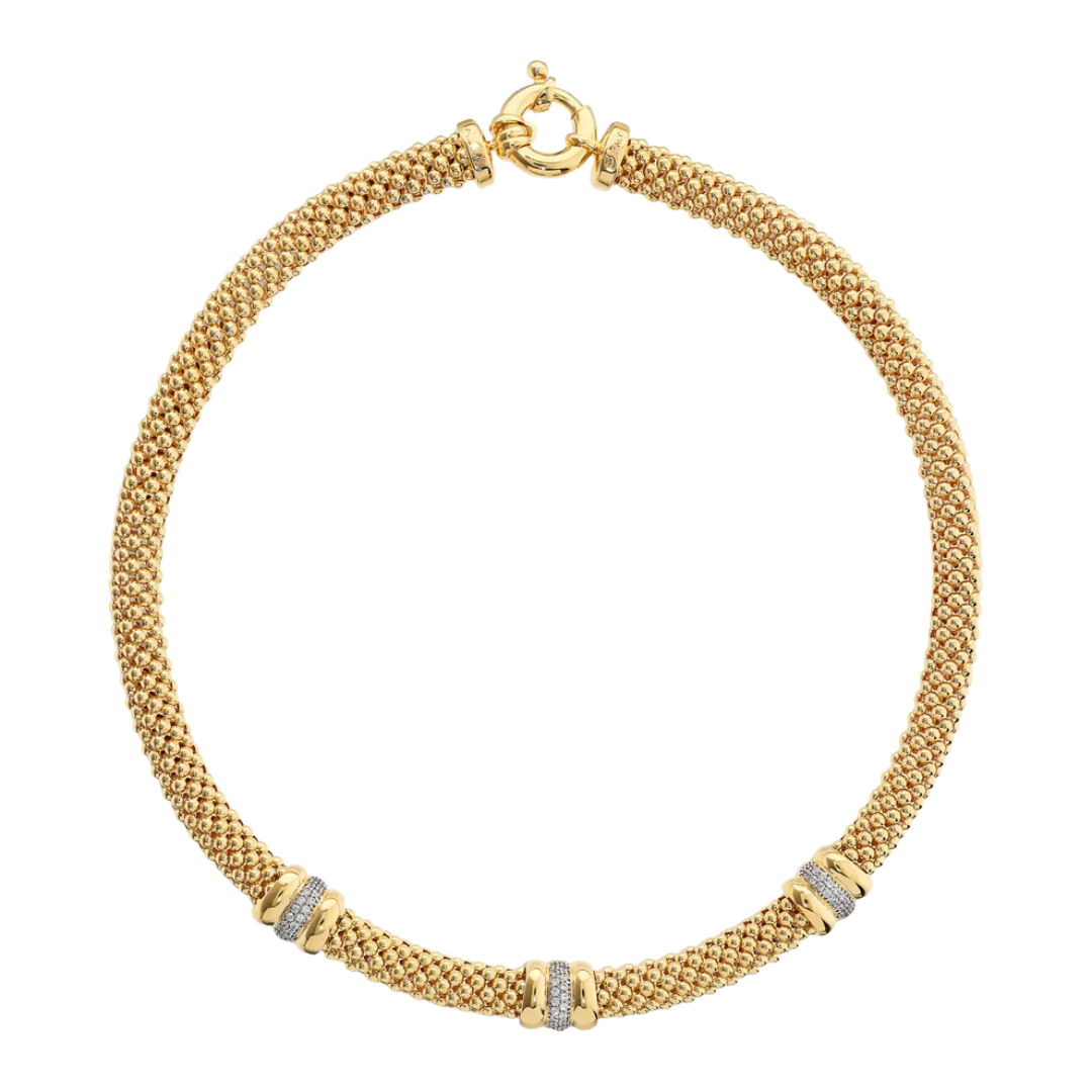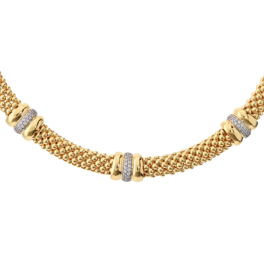Gargantilla Bronzallure de aleación Golden Rosé, chapada en oro amarillo de 18 kt, con cadena popcorn adornada con anillos pavé de circonitas cúbicas de gran luminosidad. Largo: 43 cm. Cierre de mosquetón.