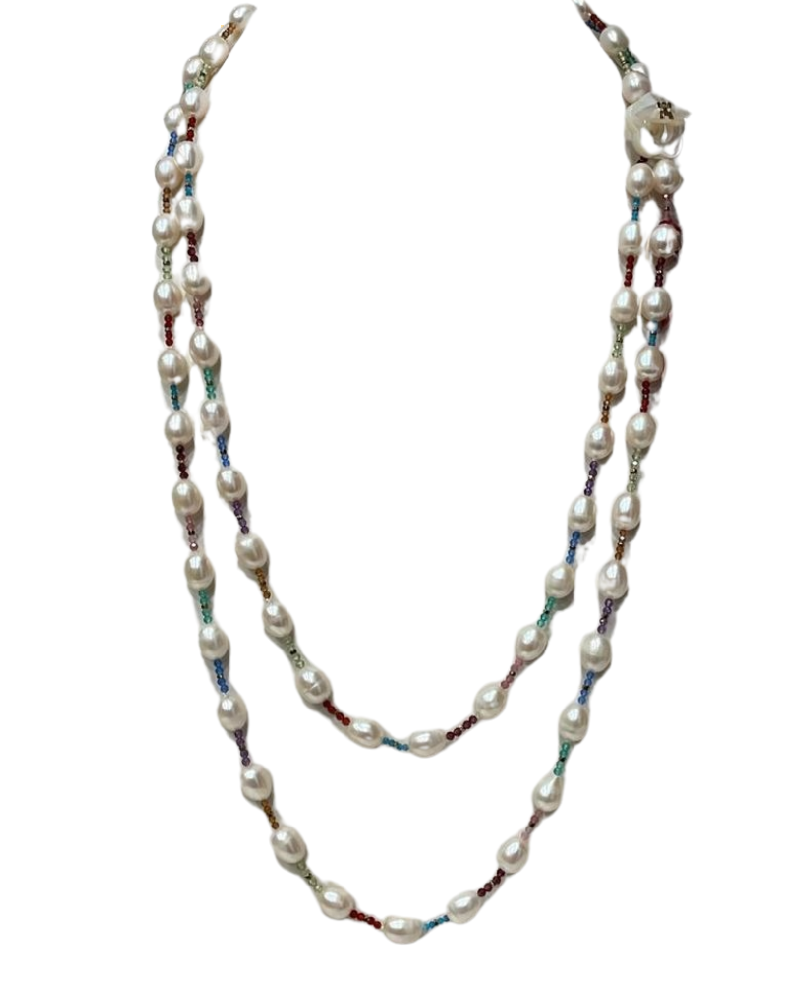 Collar Rajola Cecilia con perlas blancas naturales, turmalina y hematita de colores en azul, rosa, verde Tiffany, naranja y lila. Cuenta con un cierre de gancho de nácar y el logotipo de Rajola en oro amarillo de 18 kt. Su longitud de 138 cm lo hace versátil.