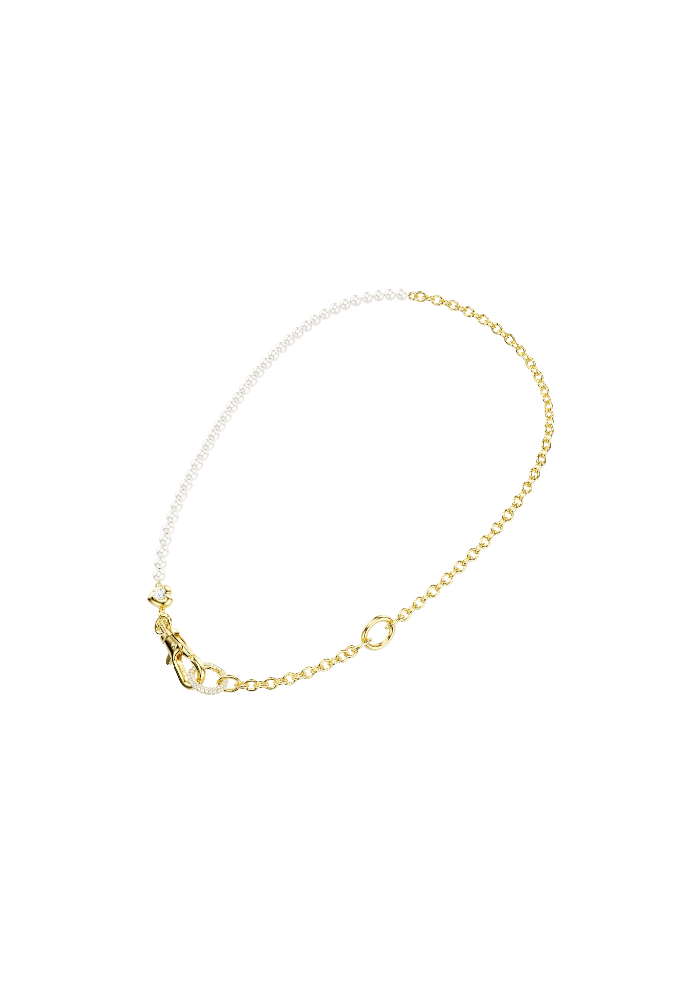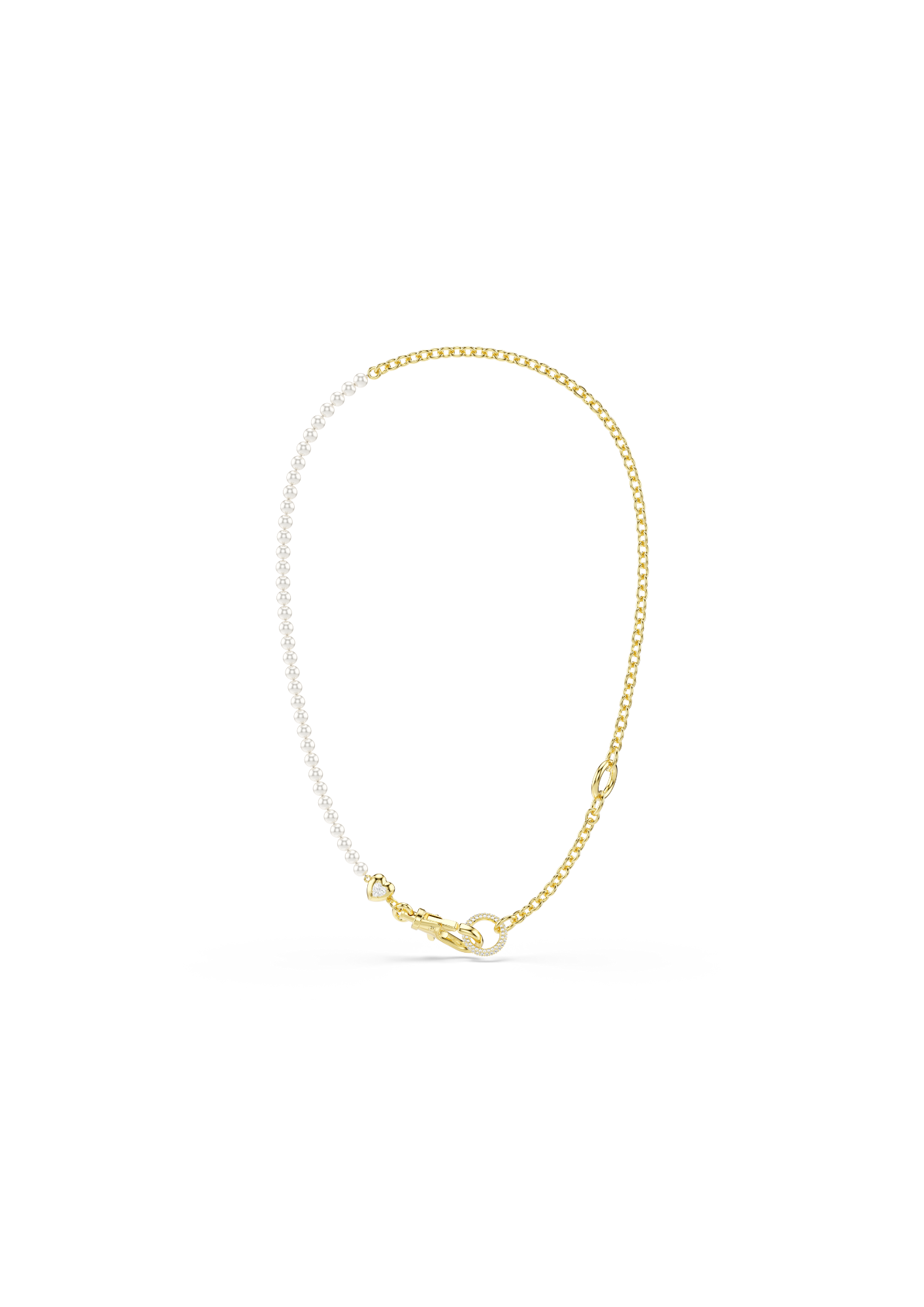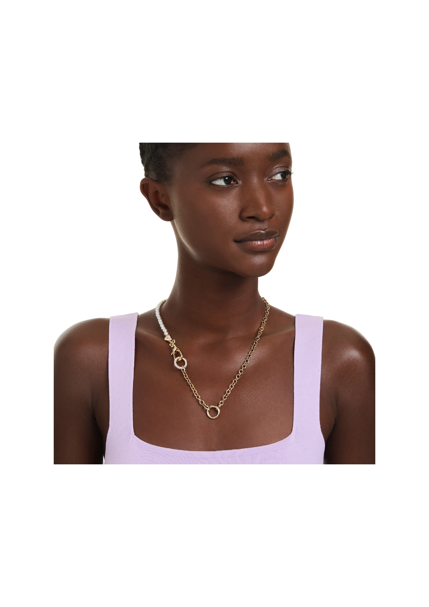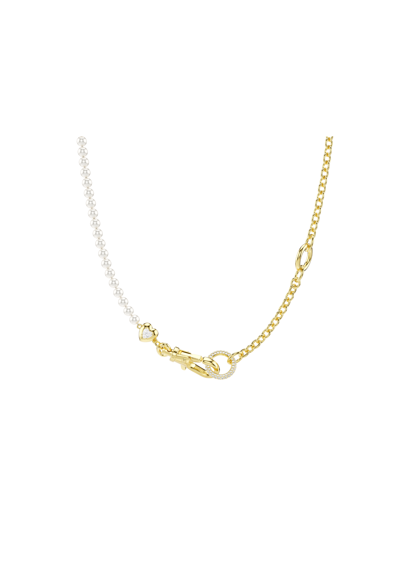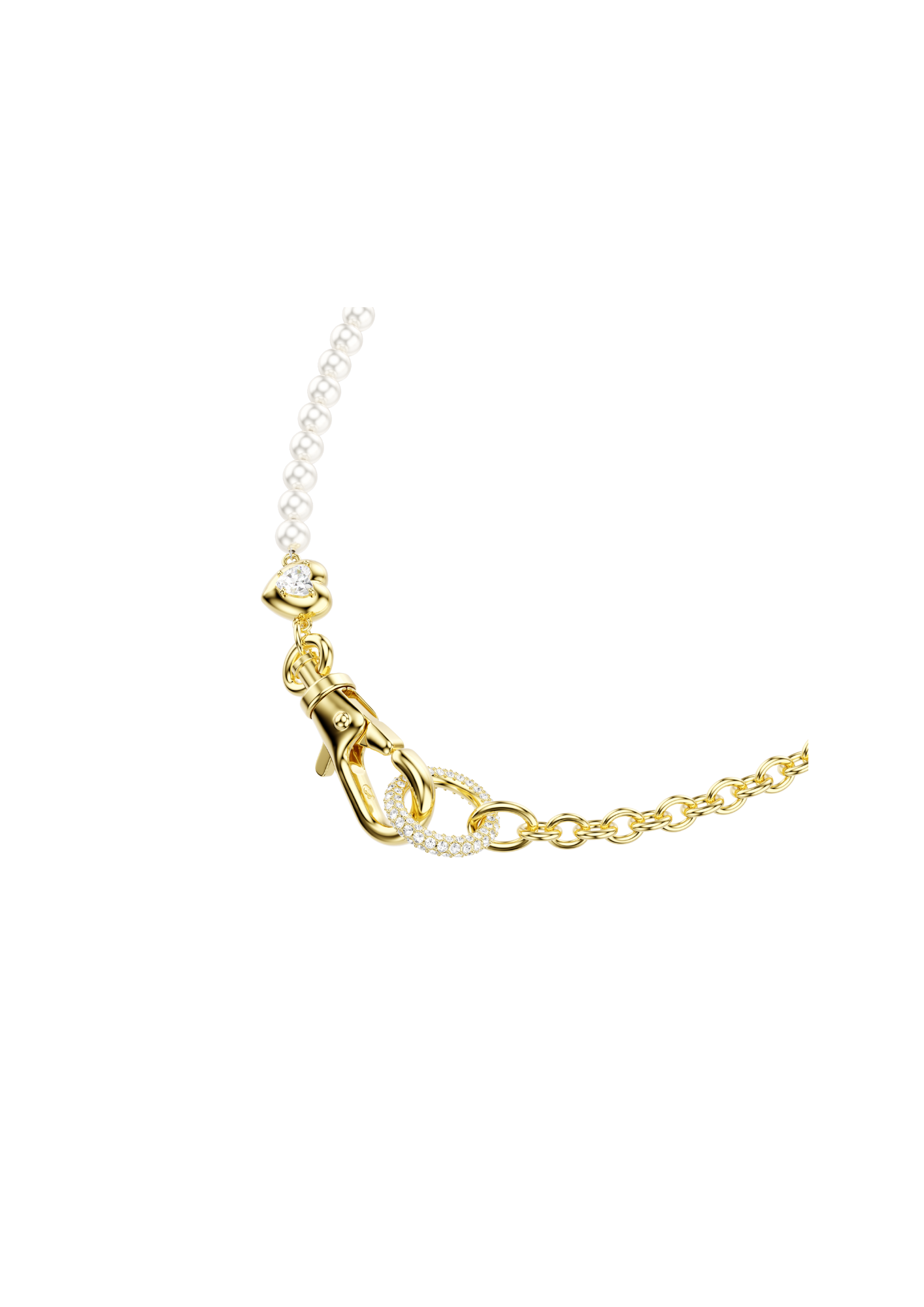 Divisa tra una catena placcata in tonalità oro e una fila di Crystal Pearls Swarovski bianche, la collana può essere indossata come un lungo stile all-around o come collana a Y, agganciando il moschettone alla maglia superiore. Il piccolo motivo a cuore regala una delicata espressione d’amore, mentre ti permette di esprimere la tua personalità aggiungendo i nostri charm Swarovski.