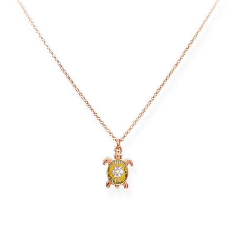 Collar de corona en plata rosa 925 con tortuga esmaltada en amarillo y pavé, chapado en oro de 18 kt. Largo del collar: 38,5 cm + 5 cm de extensión.