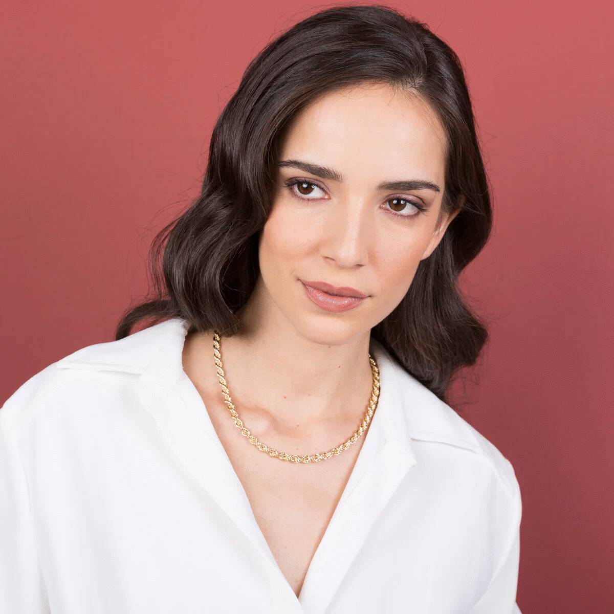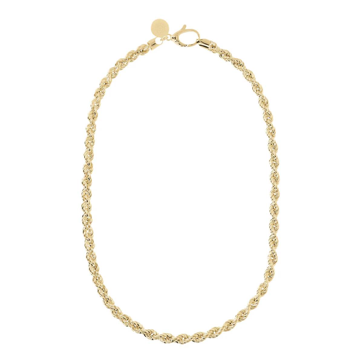 Collar Etrusca Gioielli montado sobre una base dorada, bañado en oro amarillo de 18 kt, adornado con una cadena con textura de cuerda; cierre de mosquetón. Esta clásica creación es ideal para combinar con joyas de la colección Mia, perfecta para expresar tu personalidad con líneas limpias y minimalistas.