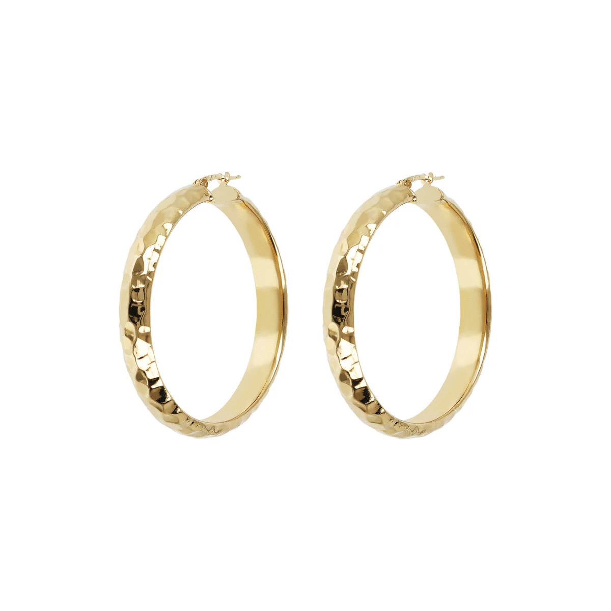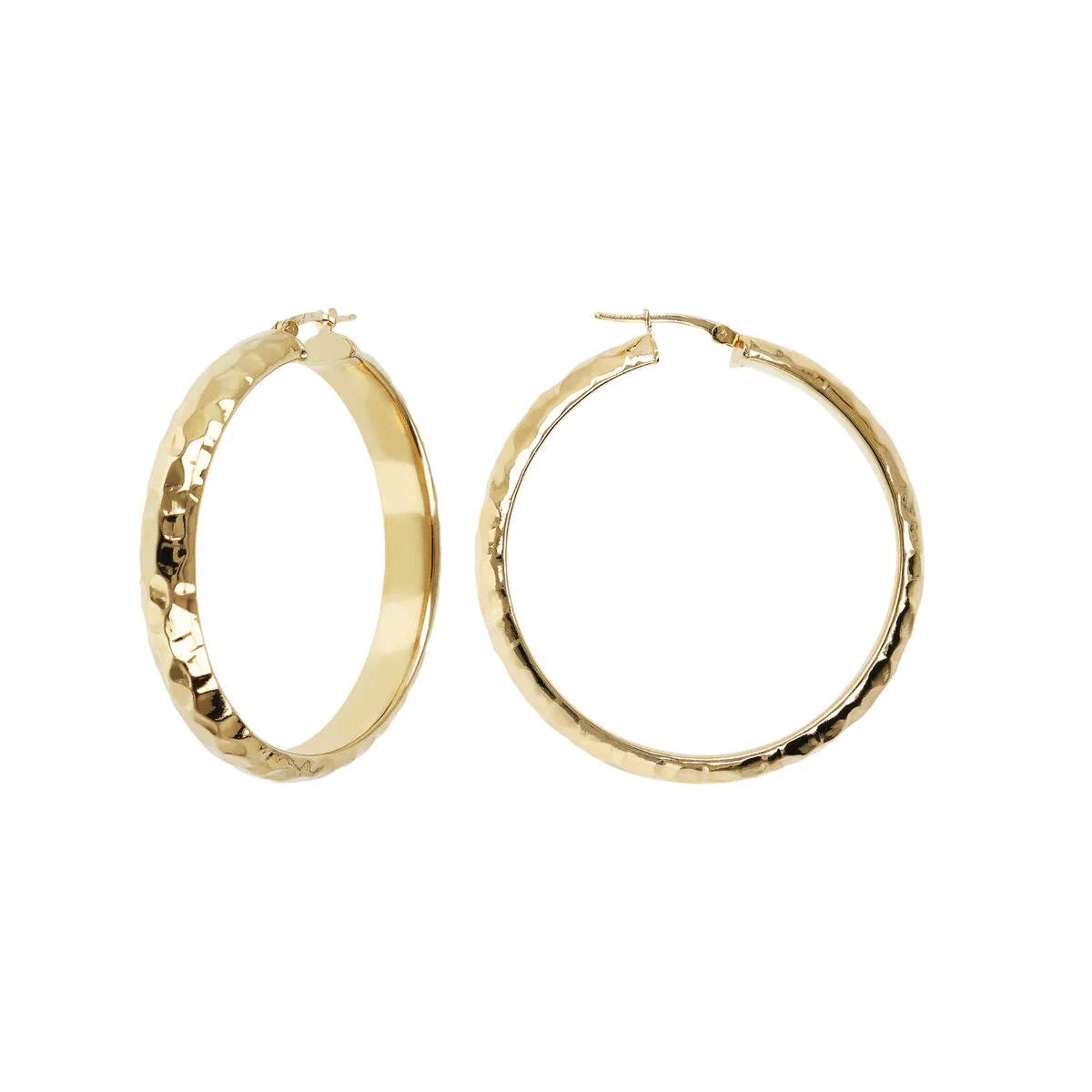 Pendientes de aro Etrusca Gioielli montados sobre una base dorada, chapados en oro amarillo de 18 kt con un clásico acabado martillado; cierre de bayoneta. Esta creación única combina a la perfección con la amplia gama de joyas de la colección Mirage, que combina un diseño moderno con un acabado martillado y un encanto atemporal.