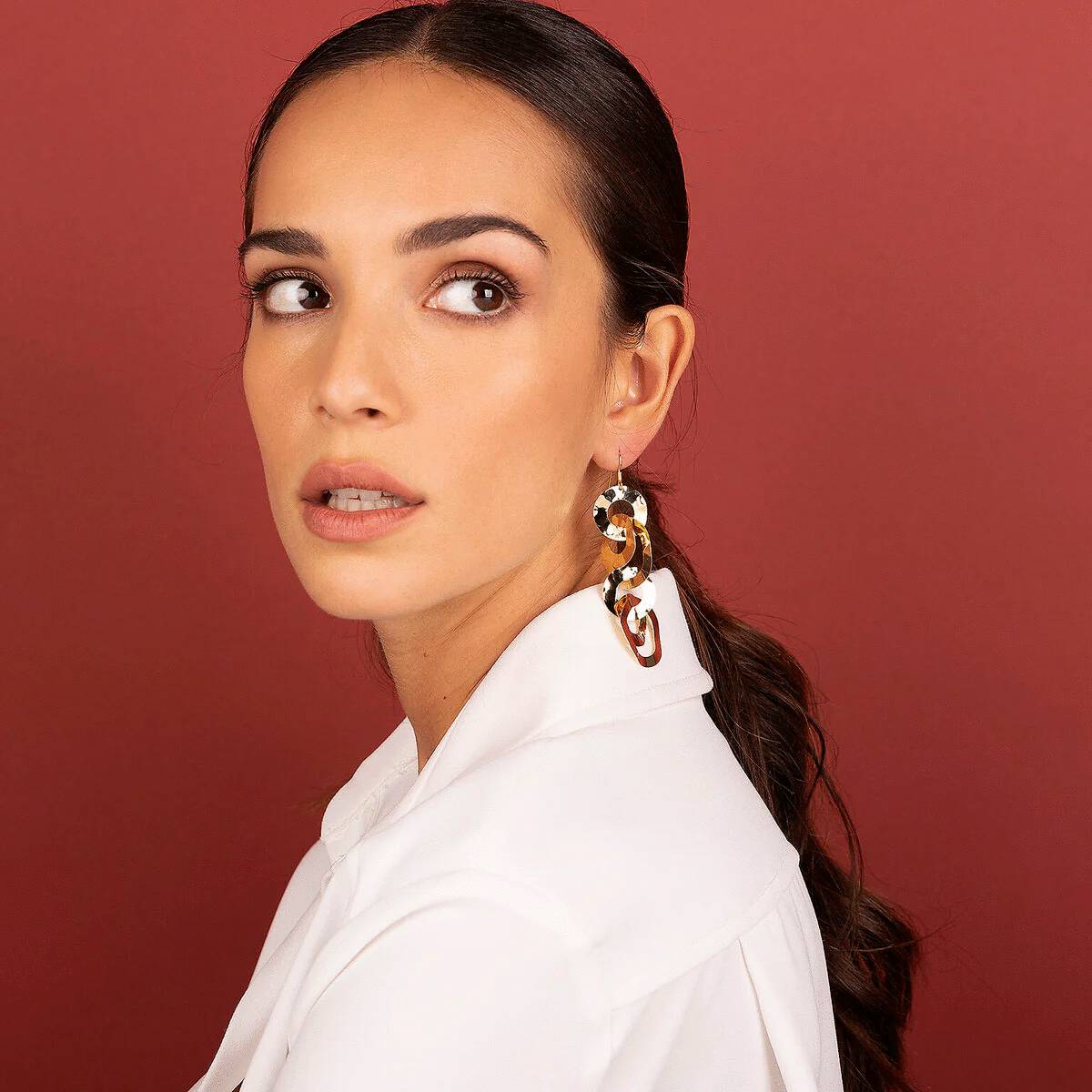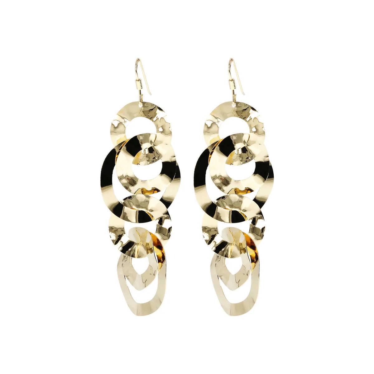 Pendientes colgantes Etrusca Gioielli montados sobre base dorada, bañados en oro amarillo de 18kt, adornados con anillos concéntricos planos con superficie martillada; cierre de gancho; largo 6,3 cm.