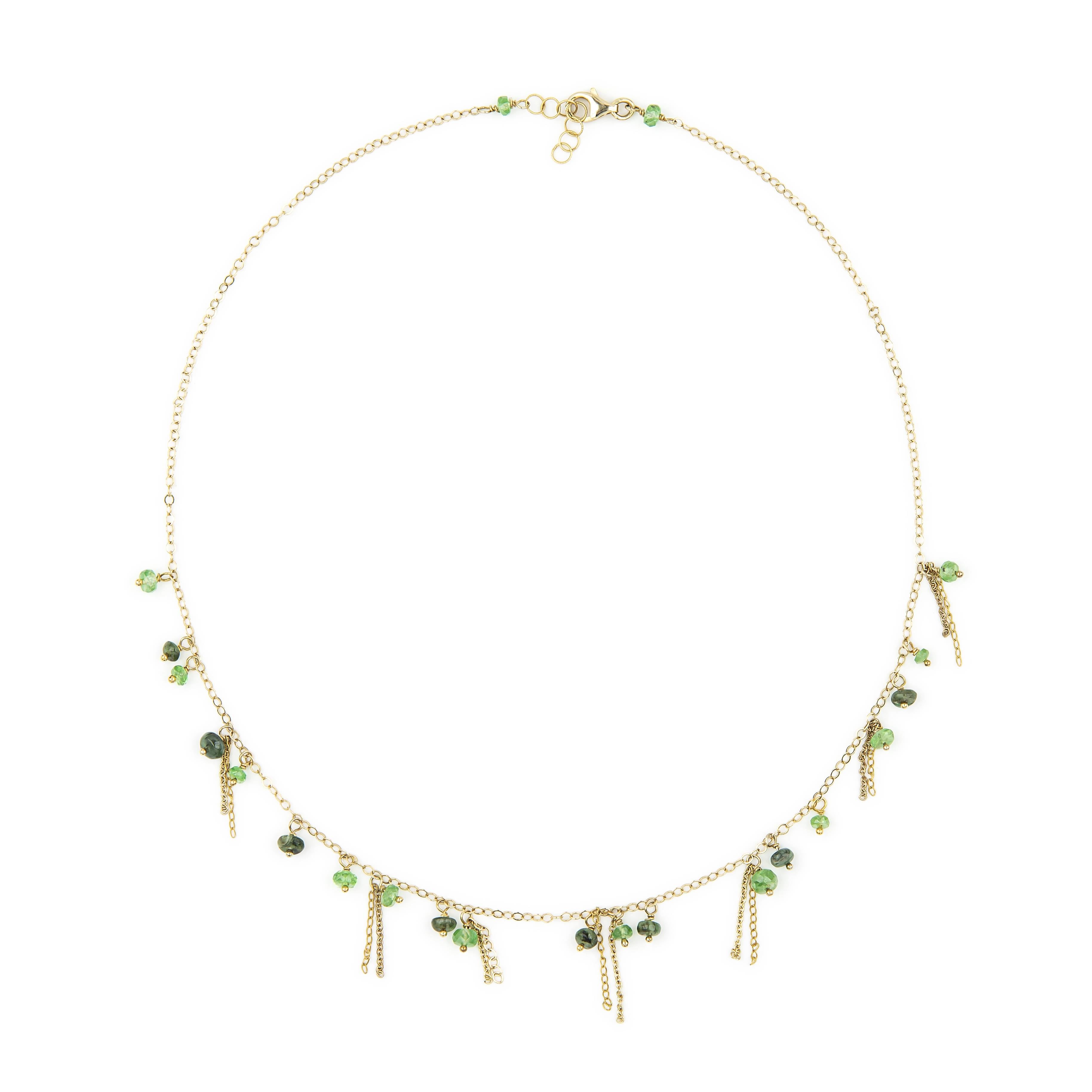 Collar Ishwara en plata 925 bañado en oro amarillo de 18 kt, con esmeraldas y tsavoritas. Largo: 45 cm.