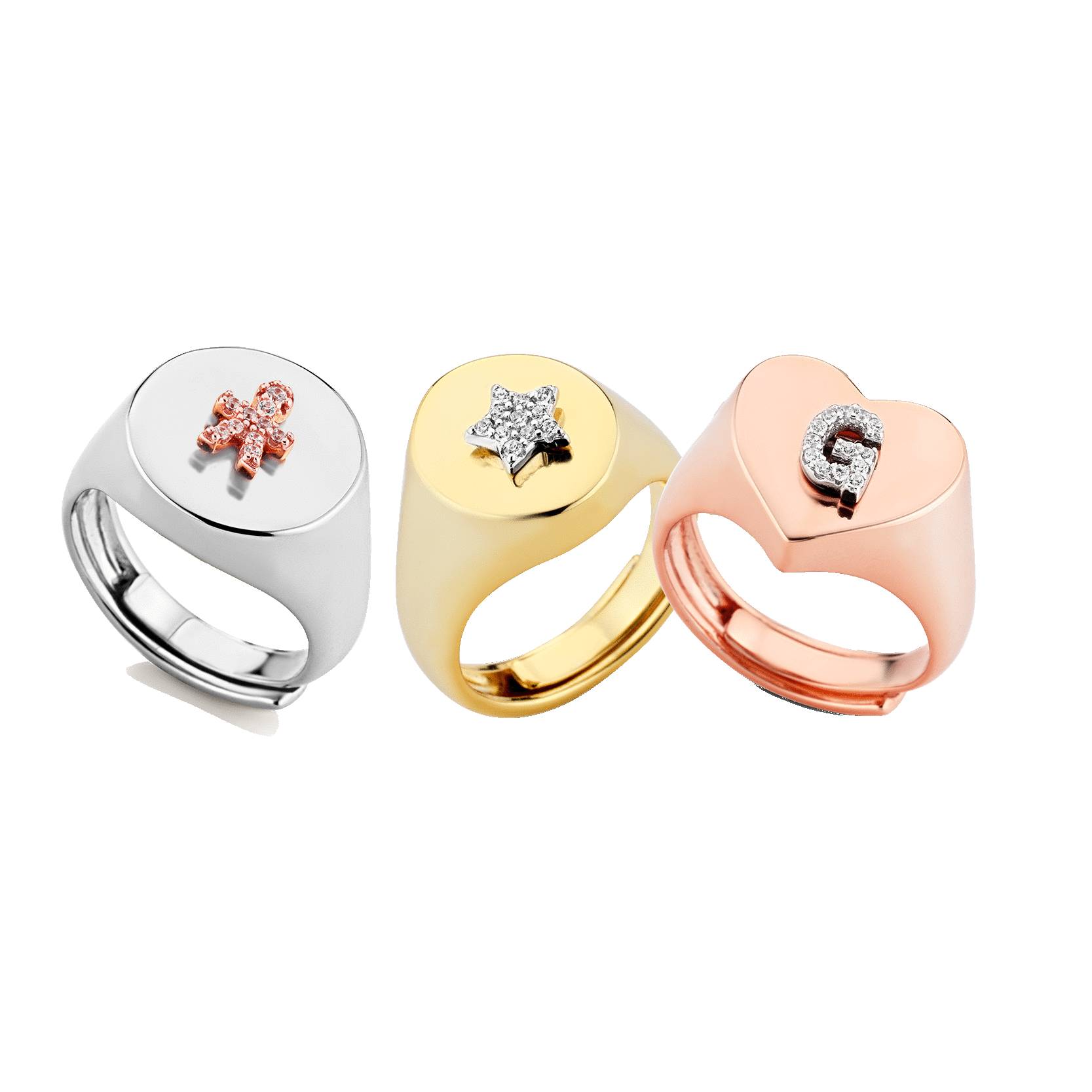 Anillo de sello ajustable en plata bañada en oro. ¡Diviértete creando tu propio anillo con las letras y símbolos de la colección Letters!