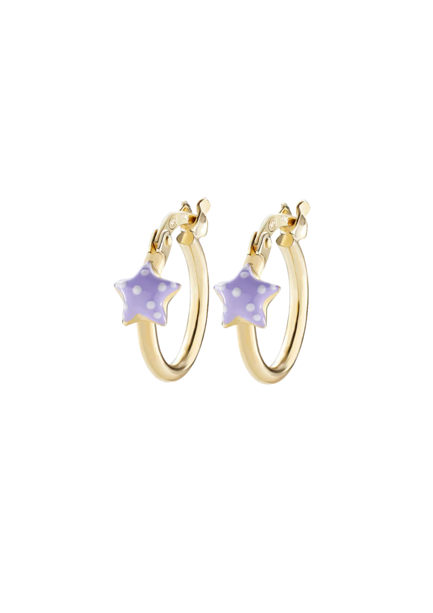 Pendientes Amen para niña de la colección Junior. Elaborados en plata 925 dorada y esmalte color glicina. Diámetro: 1 cm.