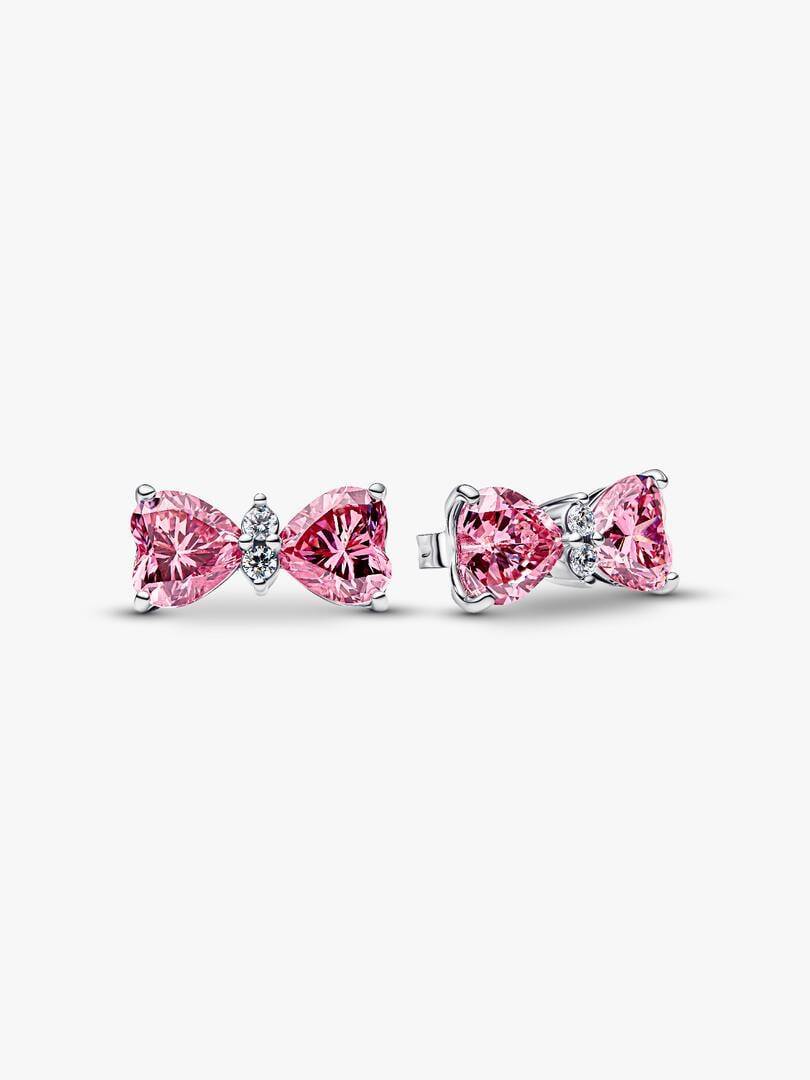 Algunos lazos nunca se rompen. Envuélvete con nuestros pendientes de botón Bow, elaborados en plata de ley 925 y adornados con circonitas cúbicas rosas y transparentes en forma de corazón, símbolo de delicada gracia.