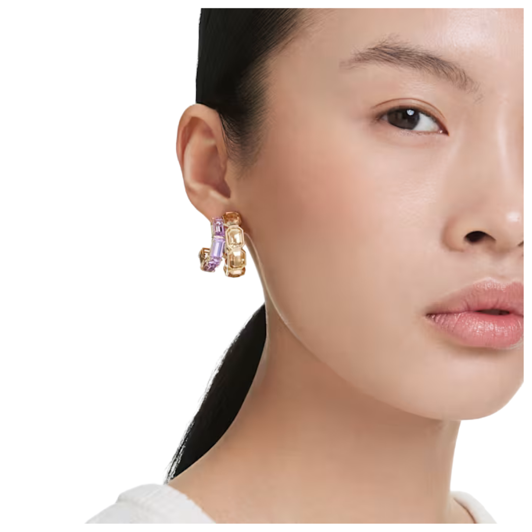 Estos pendientes multicolores son la elección perfecta para un glamour absoluto. Cada pendiente chapado en oro presenta dos mini aros asimétricos con cristales octogonales de caramelo engastados en bisel y cristales morados engastados en garra. Una impresionante combinación de contrastes que se combinan para un look audaz. Combínalos con piezas a juego de la misma familia para acentuar el efecto.