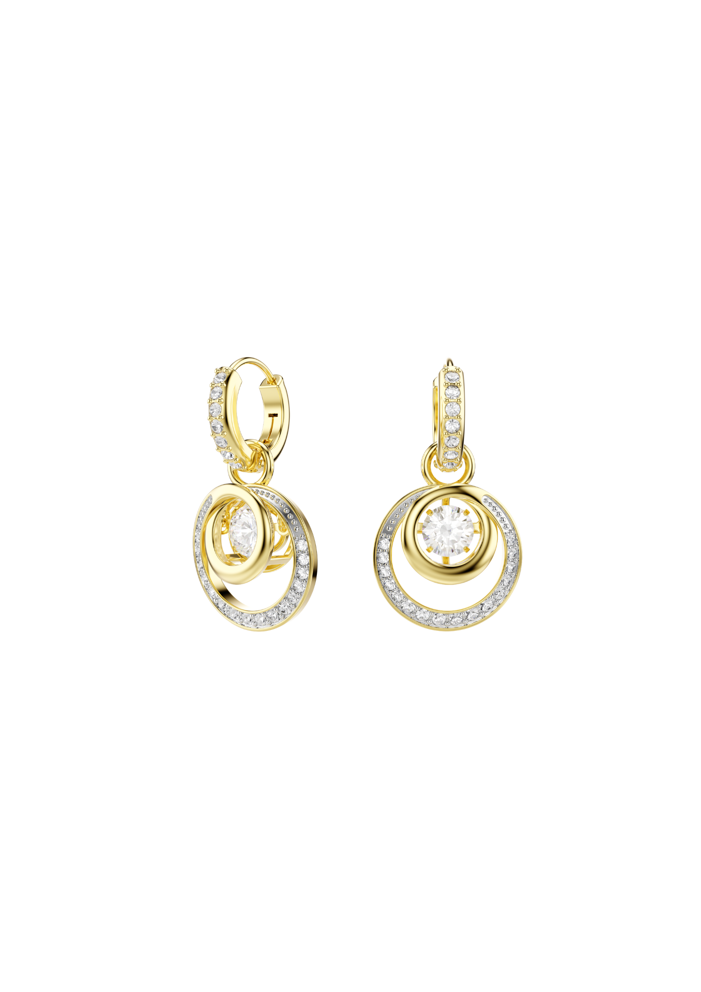 Infondi movimento nel tuo stile con gli orecchini circolari placcati in tonalità oro. Collegata a mini cerchi in pavé, ogni creazione presenta una pietra danzante centrale circondata da spirali di cristalli di varie dimensioni. Indossali con una collana o un anello coordinati per enfatizzare il look ipnotico.