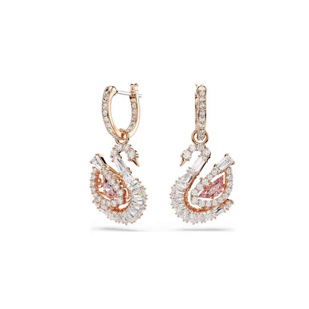 Déjate cautivar por el delicado movimiento del icónico cisne de Swarovski con estos icónicos pendientes. Sujetos a un mini aro con pavé brillante, cada elegante silueta está bañada en oro rosa y adornada con circonitas Swarovski transparentes, incluyendo una piedra danzante rosa tallada en forma de cisne. Este radiante detalle crea un movimiento infinito de color y luz, asegurando que tu estilo brille con luz propia en todo momento.