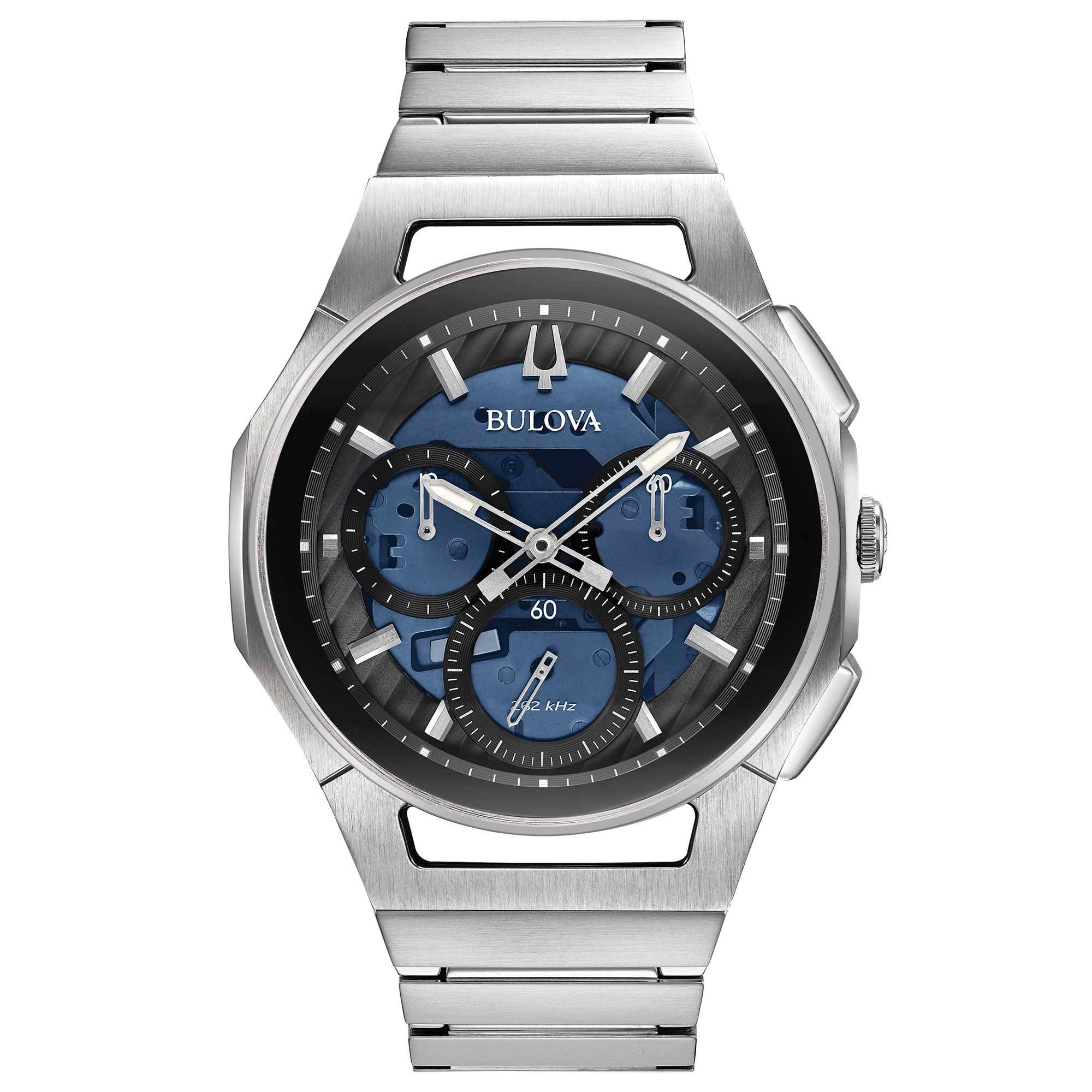 El primer movimiento de cronógrafo curvo del mundo incorpora tecnología de cuarzo de alto rendimiento con una frecuencia de vibración de 262 kHz para una precisión casi impecable. Esta versión incorpora el cronógrafo Bulova de cinco manecillas de acero inoxidable con esfera azul oscuro con agujas e índices plateados, fondo de caja transparente, cristal de zafiro curvo antirreflejos, caja atornillada, brazalete de acero inoxidable con cierre desplegable de doble pulsador y resistencia al agua hasta 30 metros.