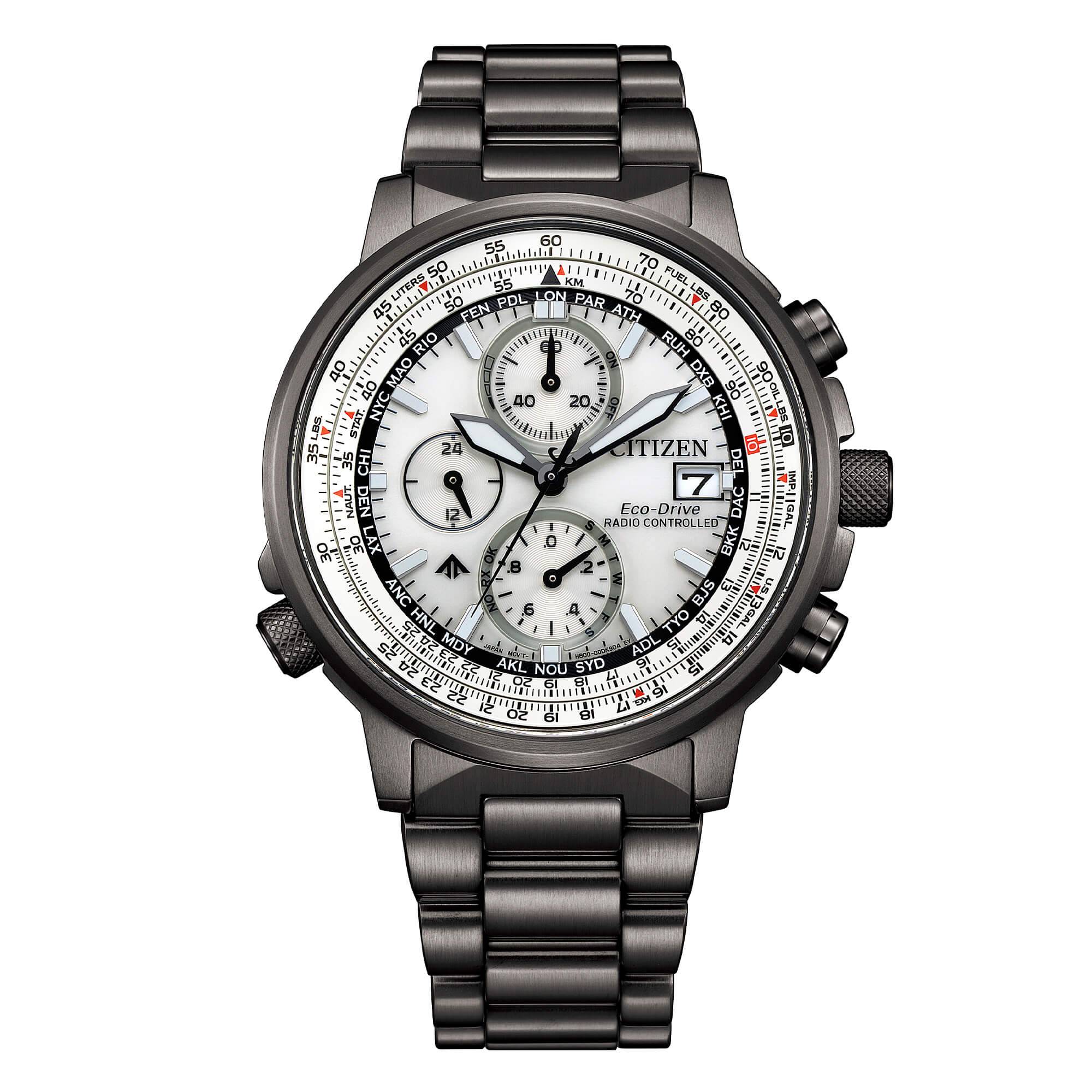 Reloj radiocontrolado Citizen para hombre, de la colección Radiocontrollato. Esta caja de acero inoxidable IP negro de 41 mm con regla de cálculo presenta una esfera blanca con índices aplicados y cristal de zafiro. El brazalete de acero inoxidable IP negro cuenta con cierre de seguridad. Este reloj cuenta con una resistencia al agua de 20 ATM y un movimiento Eco-Drive de energía solar con una reserva de marcha de 10 meses. Incluye un reloj radiocontrolado de 5 canales, horario mundial, cronógrafo, calendario perpetuo e indicador de reserva de marcha.