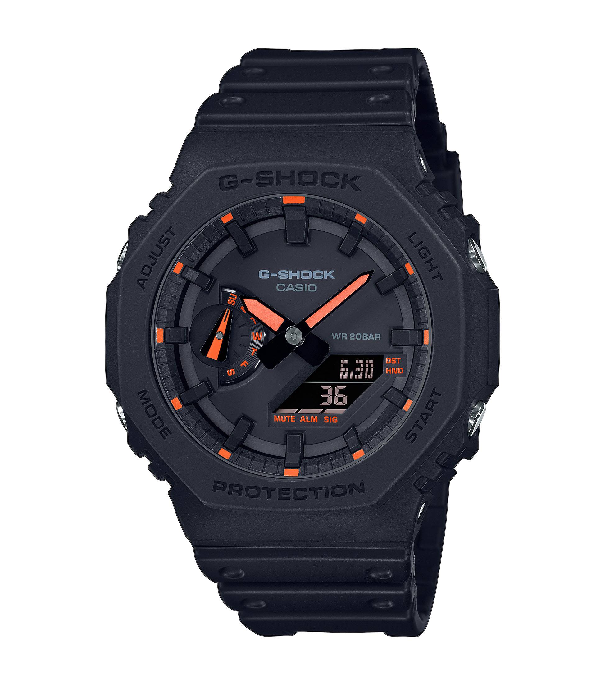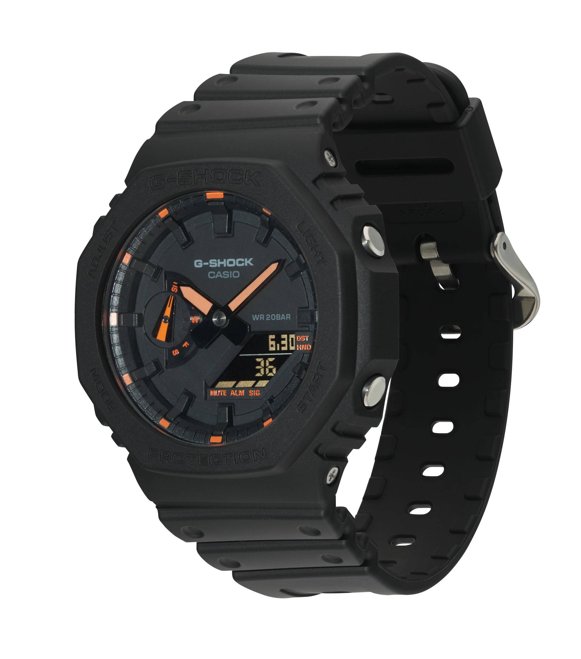 G-SHOCK, la marca de relojes indestructibles, evoluciona en una búsqueda constante de resistencia y durabilidad extremas. El modelo 2100 es una combinación digital-analógica que hereda el concepto de los modelos DW-5000C de primera generación, actualizándolo con un moderno diseño octogonal. Además, el reloj alcanza un grosor de 11,8 mm gracias a una resina fina y extremadamente rígida, reforzada con fibra de carbono. ¡El reloj también cuenta con detalles fluorescentes para realzar tu look!
