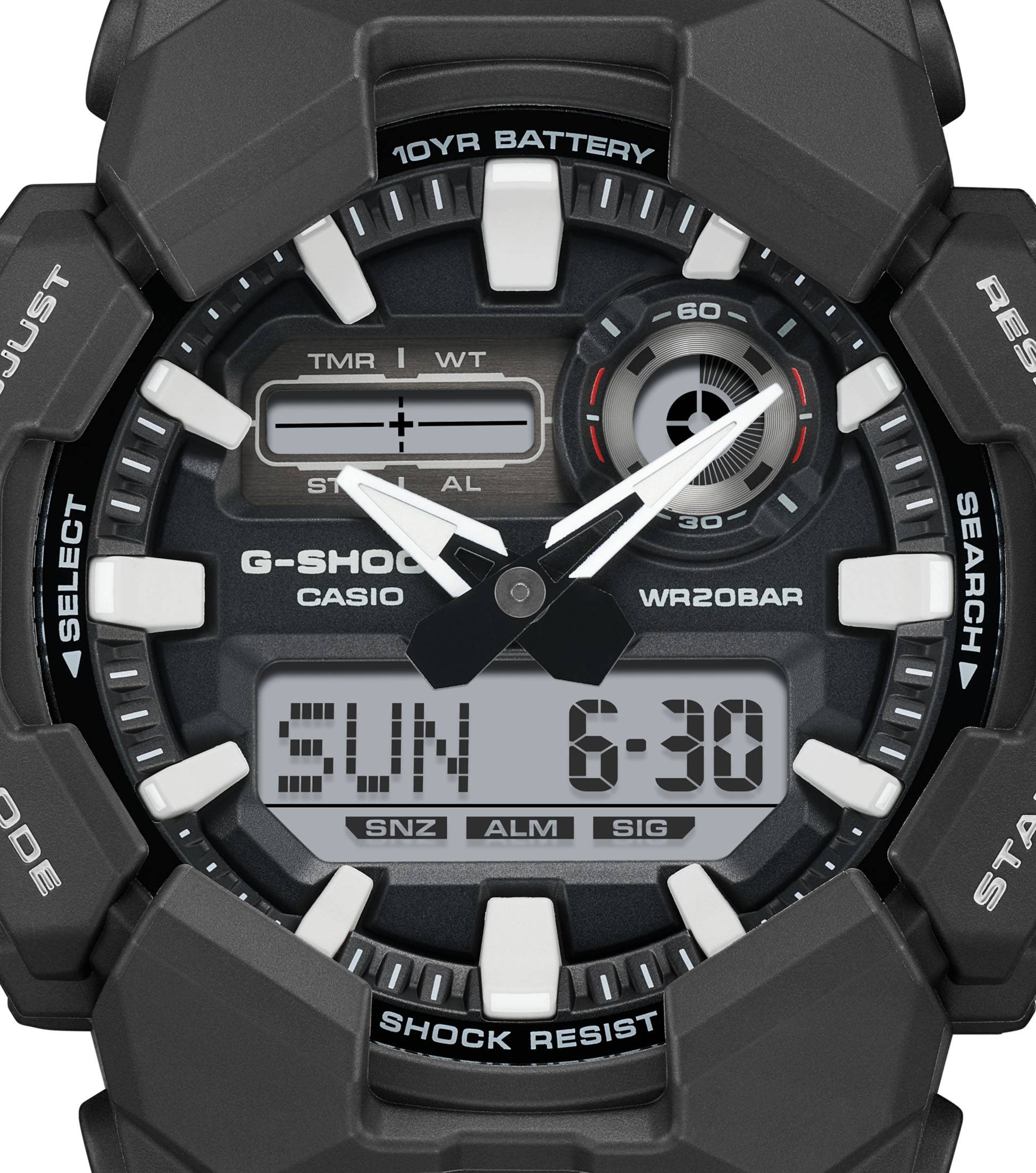 Ahorra tiempo con un G-SHOCK de caja grande y una batería de 10 años de duración que te mantendrá tranquilo por mucho tiempo. El GA-010 analógico-digital ofrece prácticas funciones como hora mundial y cronómetro, además de una luz LED de alto brillo, fácilmente accesible desde el botón grande en la parte frontal de la caja, para mayor visibilidad incluso en la oscuridad. Fabricado con resina de origen biológico y con una batería de 10 años de duración, este G-SHOCK es perfecto si quieres reducir tu impacto ambiental. Disponible en una selección de elegantes combinaciones de colores en negro para un diseño atractivo que se adapta fácilmente a entornos informales y profesionales.